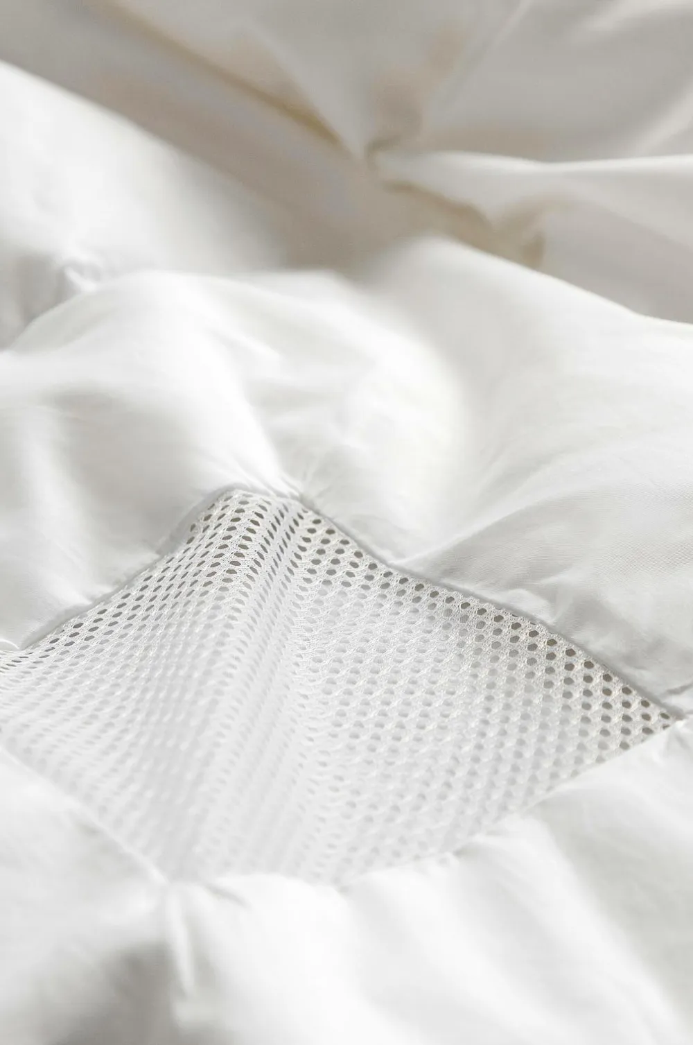Når nætterne bliver varme… føles denne dyne som et let sommerkys mod din hud. Perfekt til dem, der sover varmt, men stadig ønsker en følelse af blød komfort og luksus. Fyldt med ren europæisk andedun og syet med netpaneler, der lader luften strømme igennem og holder dunene jævnt fordelt – en kølig, luftig dyne, der knap nok kan mærkes, men alligevel gør hele forskellen. Dyne er fyldt med 100 % europæisk andedun, der giver fremragende åndbarhed, lav vægt og blød komfort. Netpaneler inden for firkanterne forbedrer luftgennemstrømningen og forhindrer klumpning, mens konstruktionen gør det muligt for dynen at forme sig blidt efter din krop. Resultatet er en let, behagelig og kølig dyne med naturlig bevægelsesfrihed. Betrækket – en tæt vævet, silkeagtig blød blanding, der giver naturlig temperaturregulering, effektiv fugttransport og bæredygtig luksus. Fyldkraft: 800 Cuin.