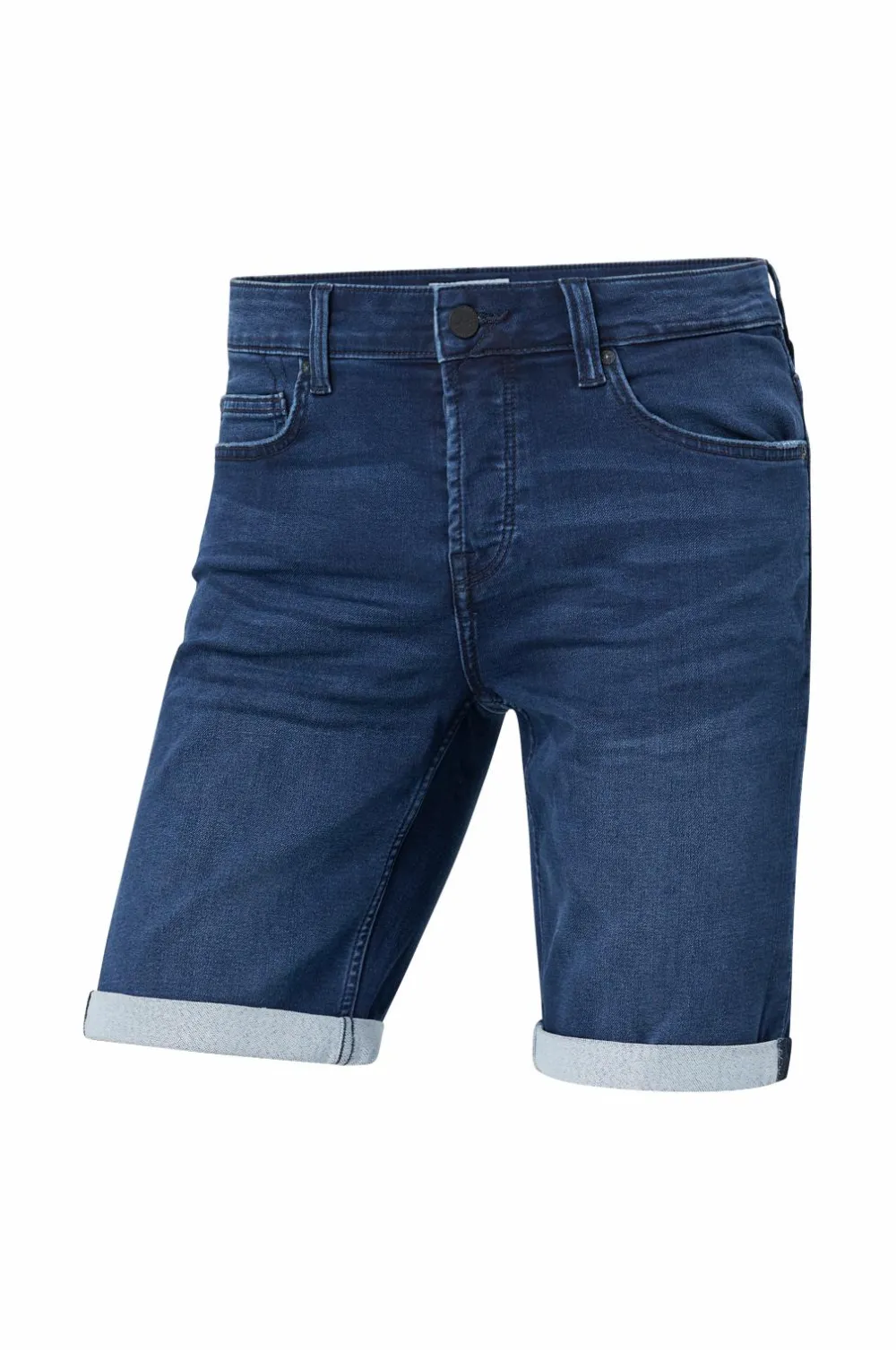 Denimshorts i stretchdenim med lige ben. 5-lommemodel med knapgylp. Opsyet benkant.