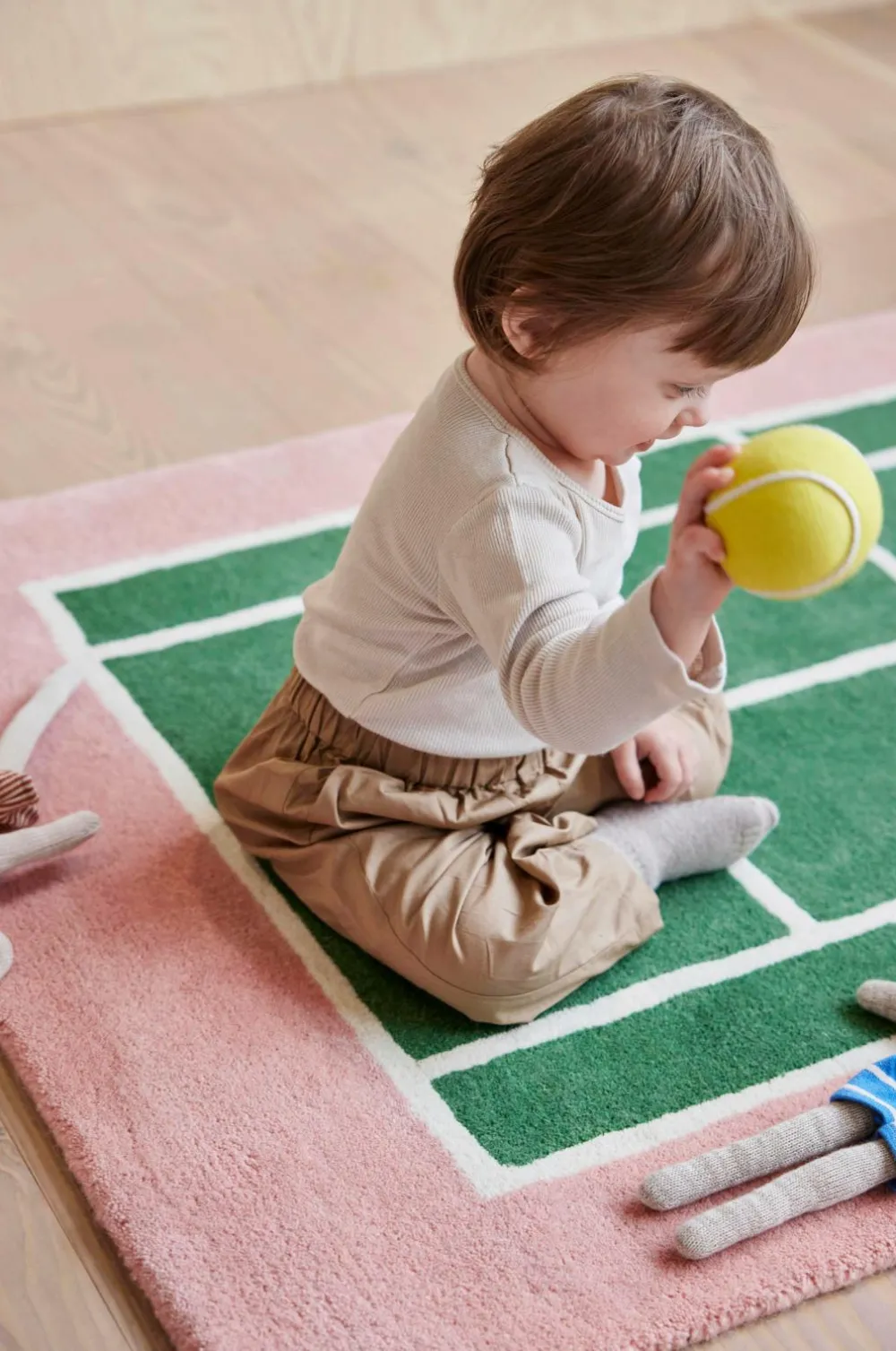 Tæppet tennis, der er en del af tennis -kollektionen, har realistiske tennis -farver, der giver en sporty stemning. Tæppet er fremstillet af en uld- og bomuldsblanding og giver en blød fornemmelse under fødderne, så dit barn får varme og komfort, når det leger, kravler eller slapper af.