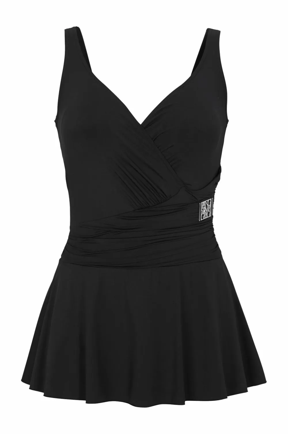 Badedragt Venezia fra Panos Emporio i flatterende model med skørt og drapering foran i taljen. Slå-om snit foroven der er fastgjort foran ved halsen og med formpressede skåle med blød elastikkant forneden. Afskæring bagpå i taljen og metalsmykke foran i den ene side. Foret skridt. Længde fra skulderen ca. 62 cm i str. M.