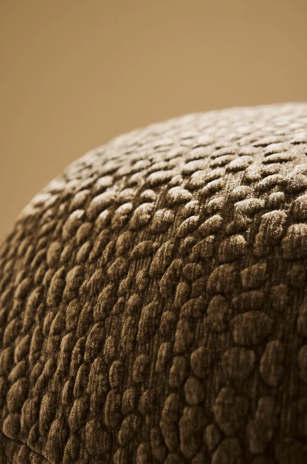 Puf i hyggelig polstring, rund med skrællet top. Puffen er, hvad du gør den til, en behagelig fodskammel, der bliver til en ekstra siddeplads, når der er brug for det. Puffen er komfortabelt konstrueret med en ramme af FSC-certificeret fyrretræ og krydsfiner kombineret med elastiske bånd, koldskum, zigzagfjedre og polyestervat. Betrækket er godt syet og har en god pasform, ikke aftageligt.