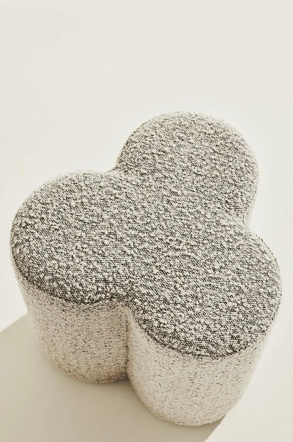 Puffen er formet som en trekløver og er velegnet som puf, fodskammel eller bord med en lille bakke på. Puffen er beklædt med blød bouclé. Garnet som stoffet er vævet af har små løkker og knuder som skaber et blødt stof med let krøllet overflade. Stoffet er meget slidstærkt med Martindale på 79000. Rammen er af FSC-certificeret fyrretræ og plywood som er beklædt med behagelig og fast polstring.