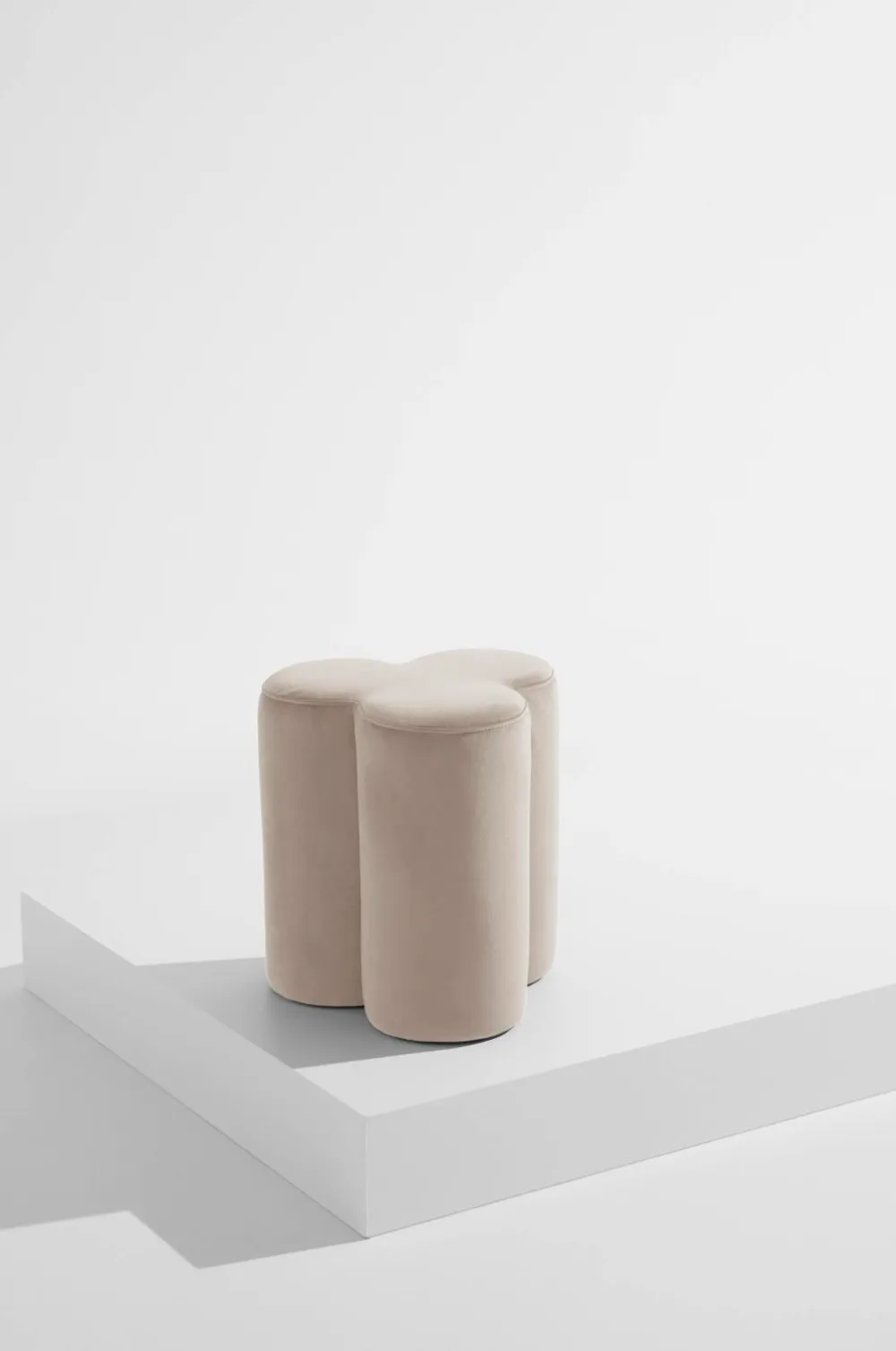 Puf formet som en trekløver. Den er velegnet som puf, fodskammel eller bord med en lille bakke på. Puffen er beklædt med blød velour af genindvundet materiale. Velour varierer i forskellige nuancer afhængigt af hvordan lyset falder. Rammen er af FSC-certificeret fyrretræ og plywood som er beklædt med behagelig og fast polstring.