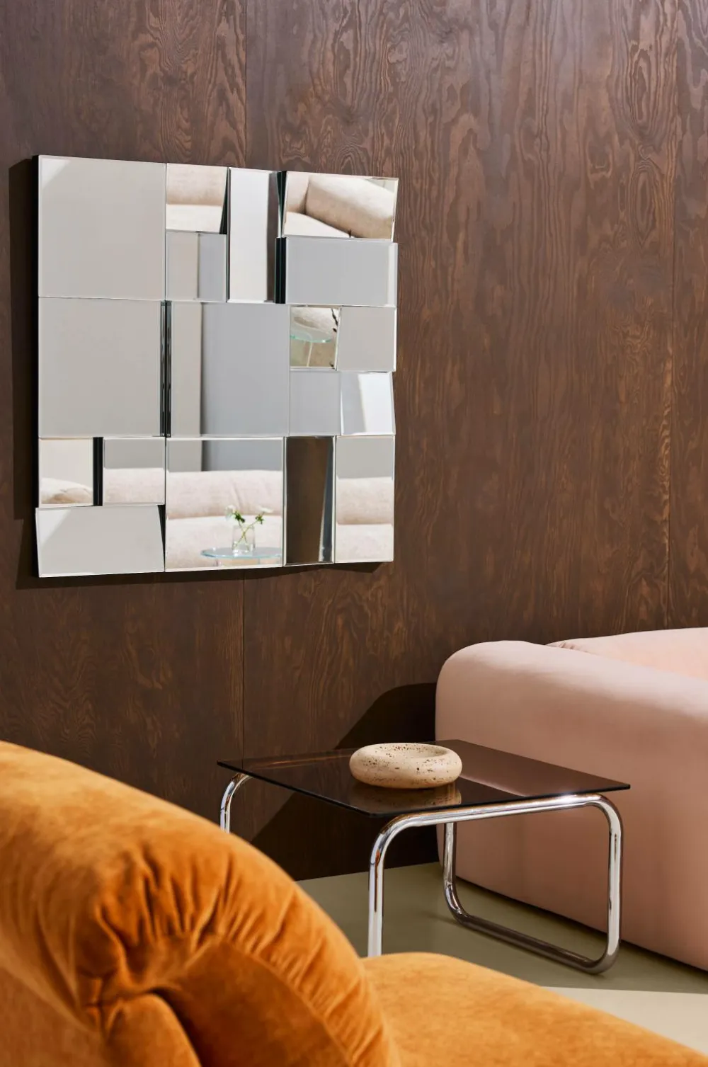 Farrah-spejlet har en spændende form, der skaber en effekt i rummet og tiltrækker øjet. Farrah er ikke kun et spejl, det er også en stilfuld vægdekoration. Spejlets ophæng er fleksibelt, og det kan hænges både vandret og lodret. Bagsiden er lavet af FSC-mærket, sortmalet MDF, og en sort kant er synlig fra siden.