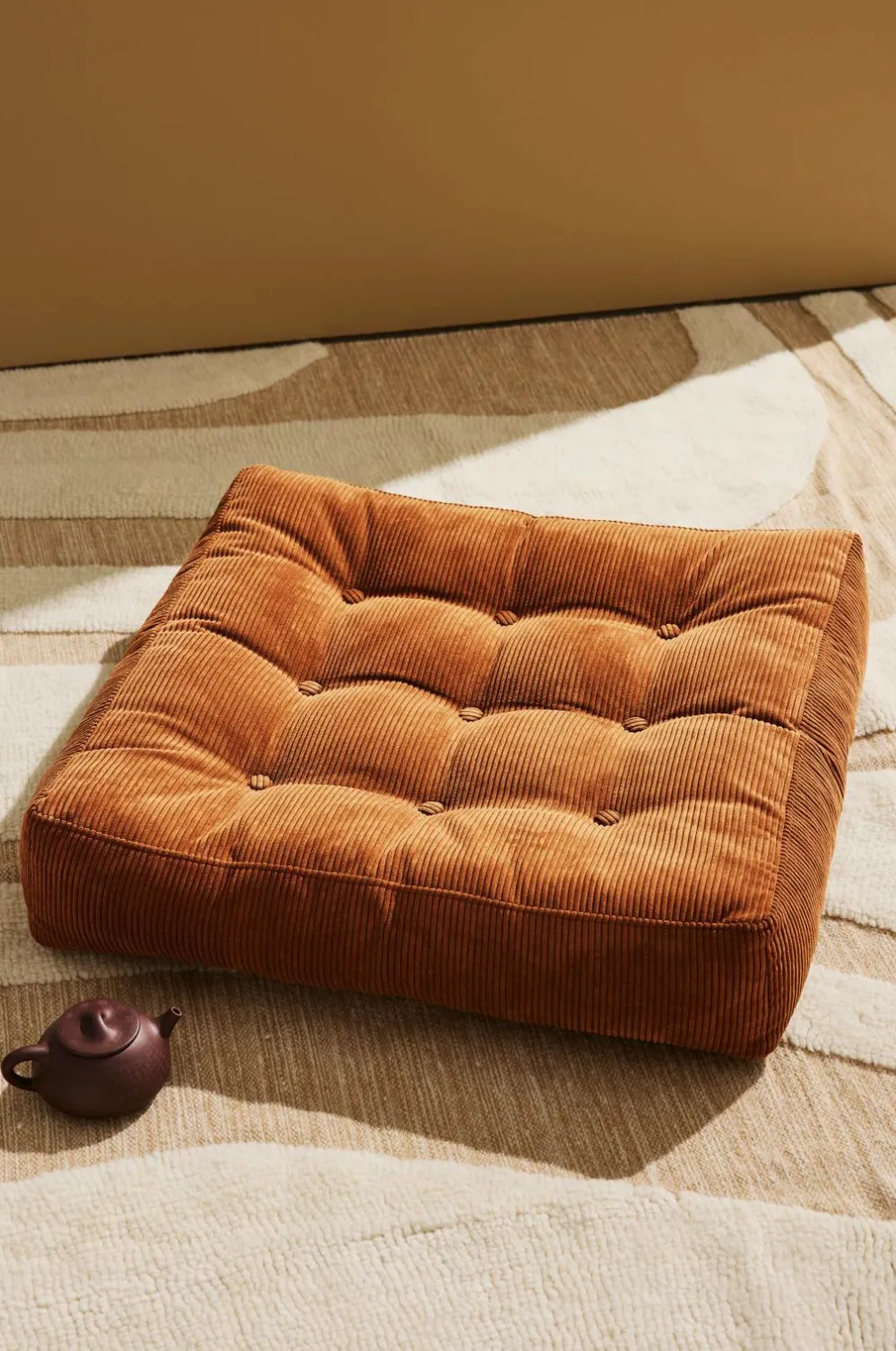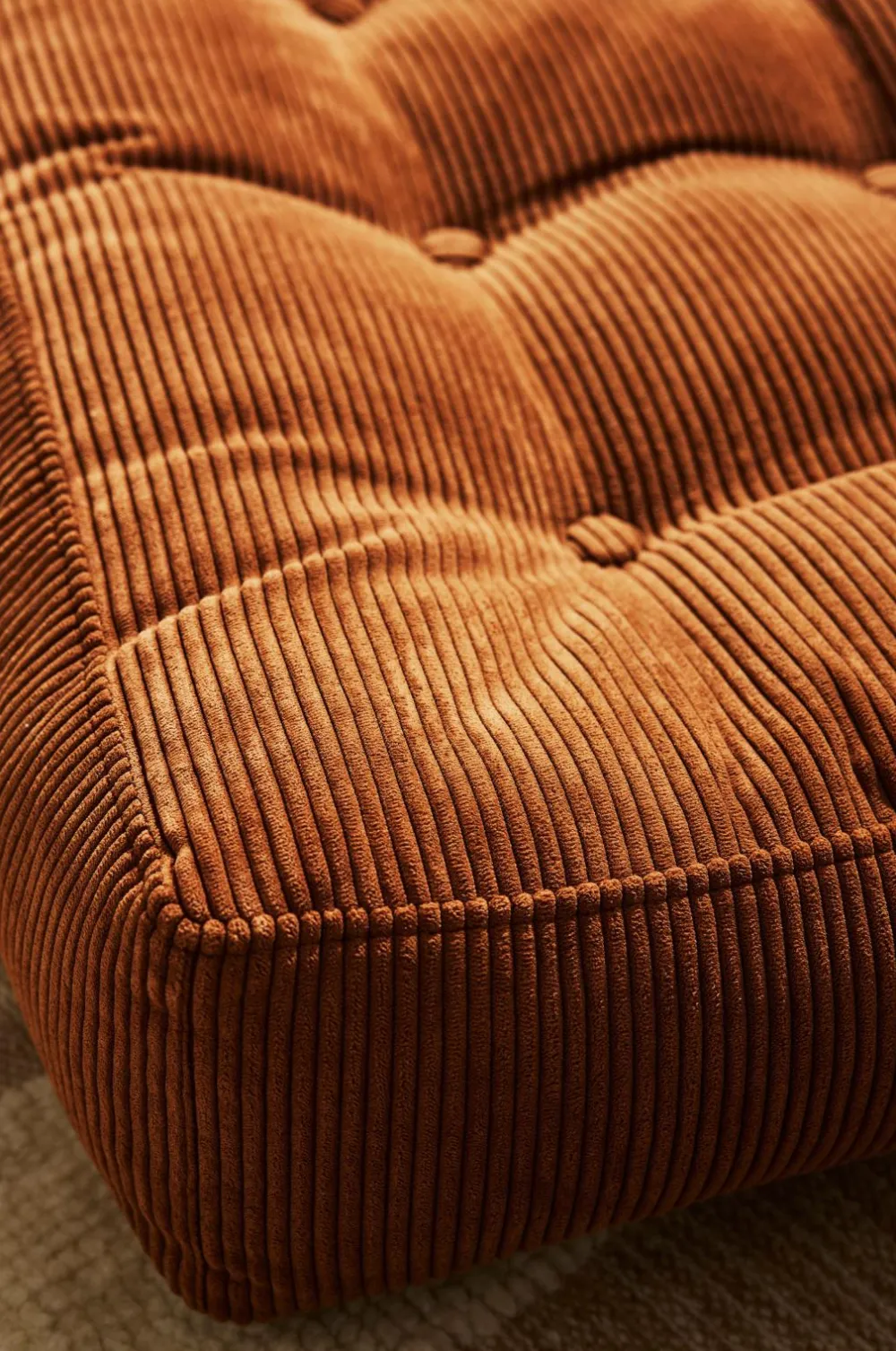 En gulvpude i blødt fløjlsstof. Den er designet med 9 dybt tuftede, polstrede knapper og har en diskret lynlås nær gulvet.