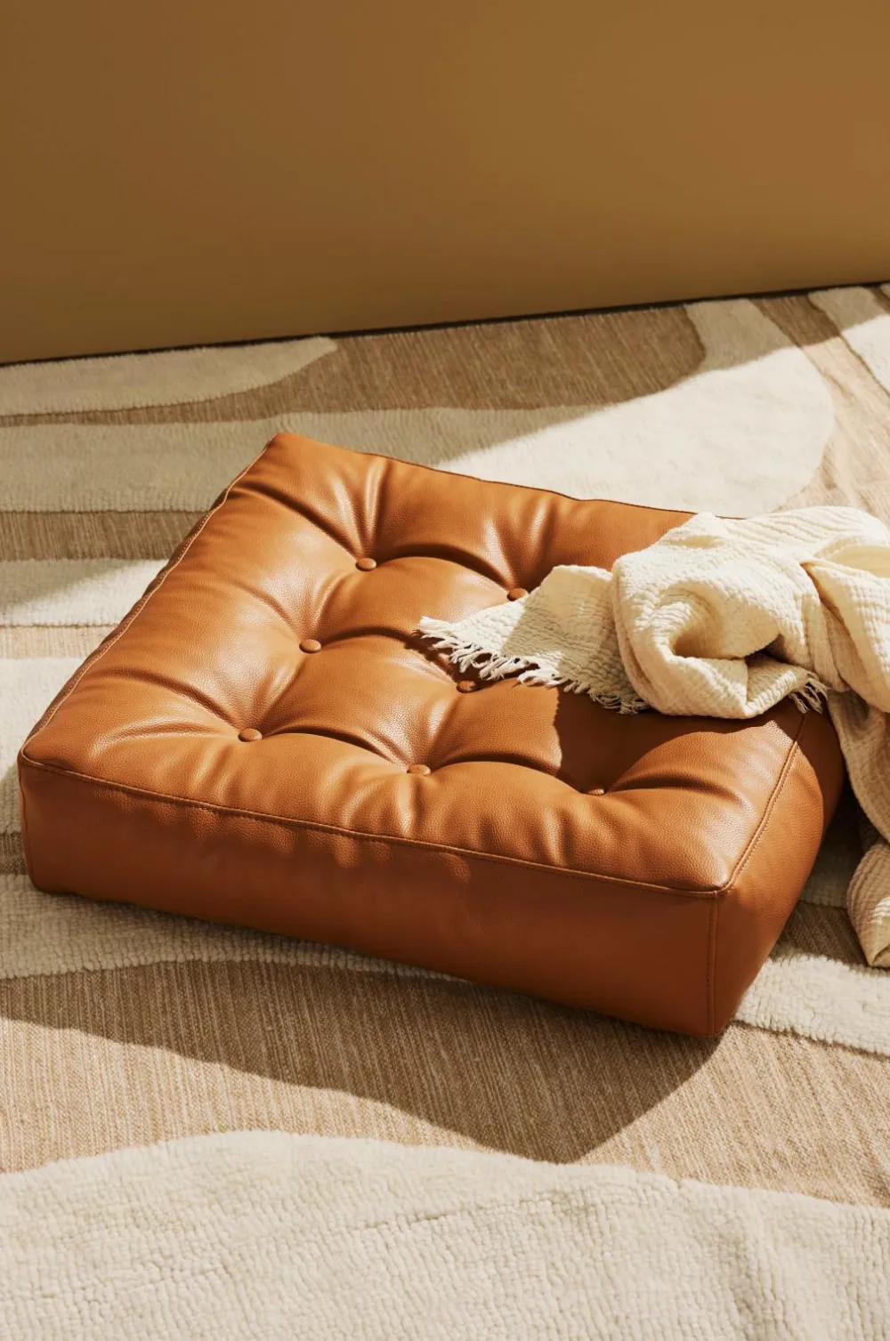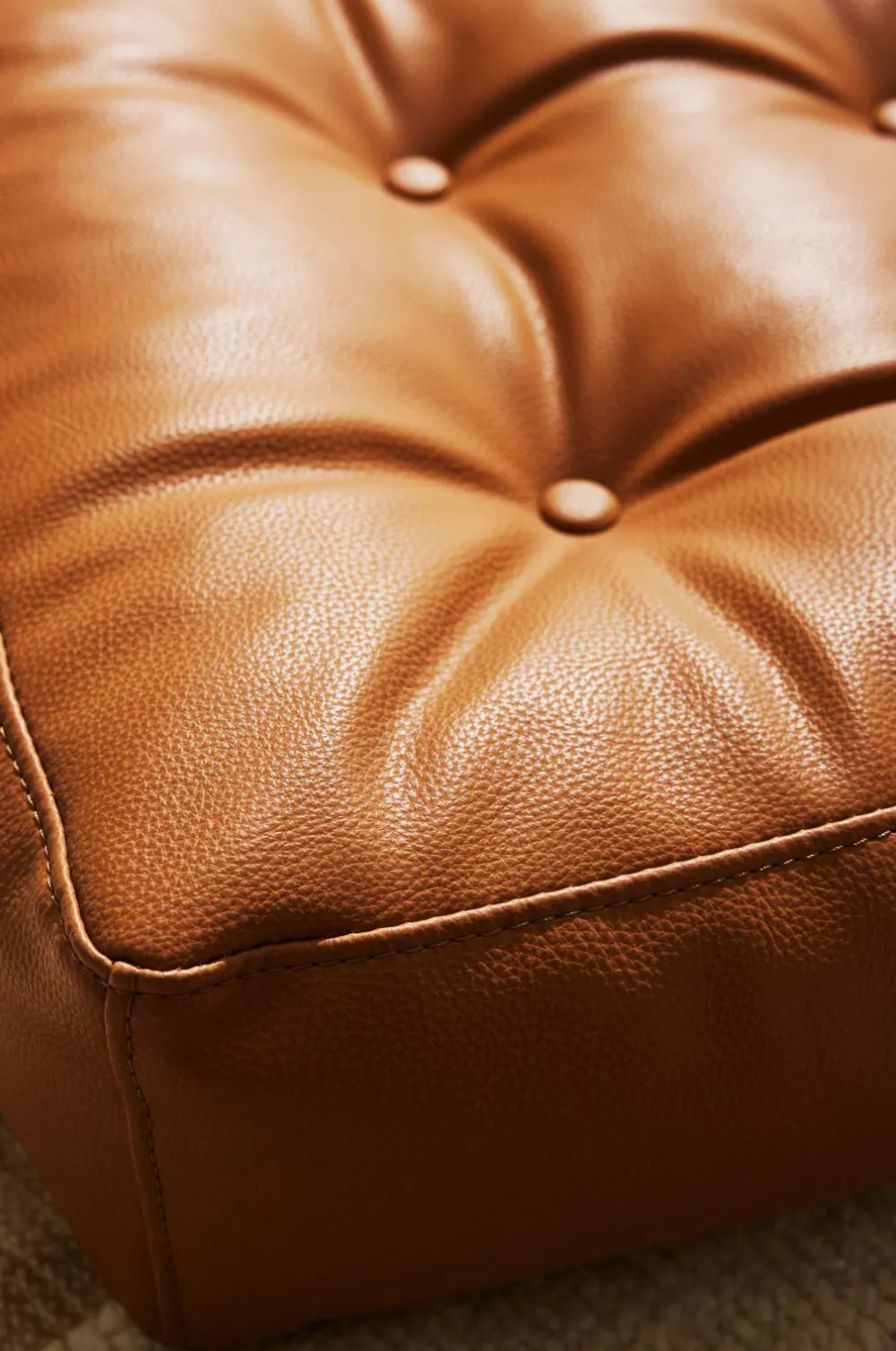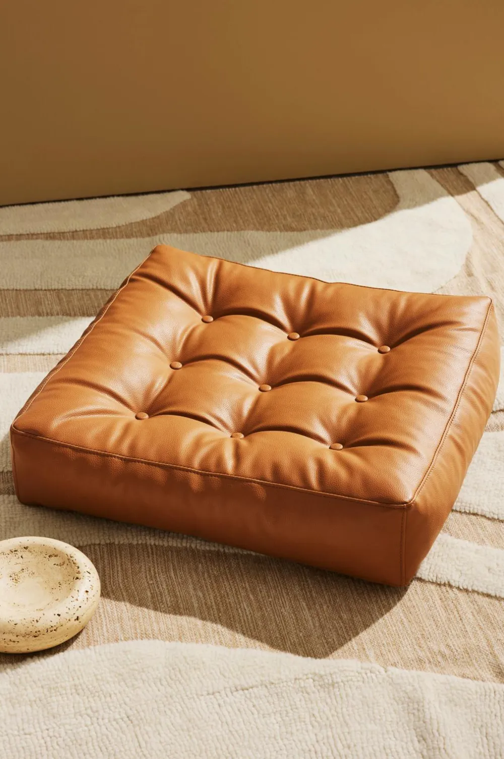 En blød gulvpude i vegansk læder. Den er designet med 9 dybt tuftede, polstrede knapper og har en diskret lynlås nær gulvet.