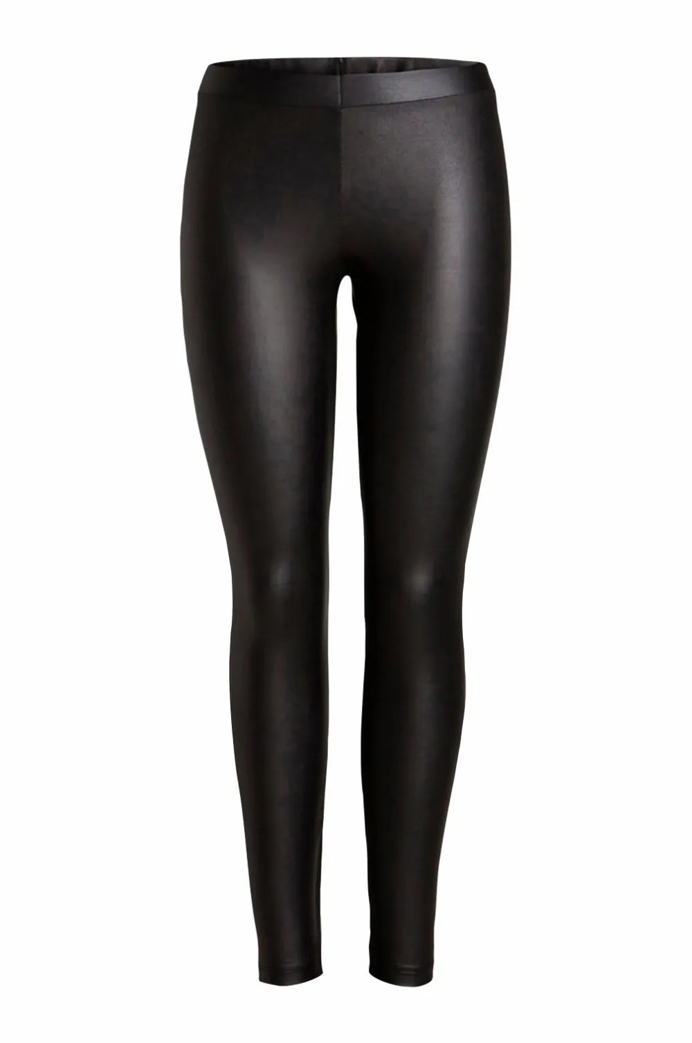 Leggings pcNew Shiny fra Pieces. Kropsnær model i stretch imiteret skind med påsyet linning som har indsat elastik.