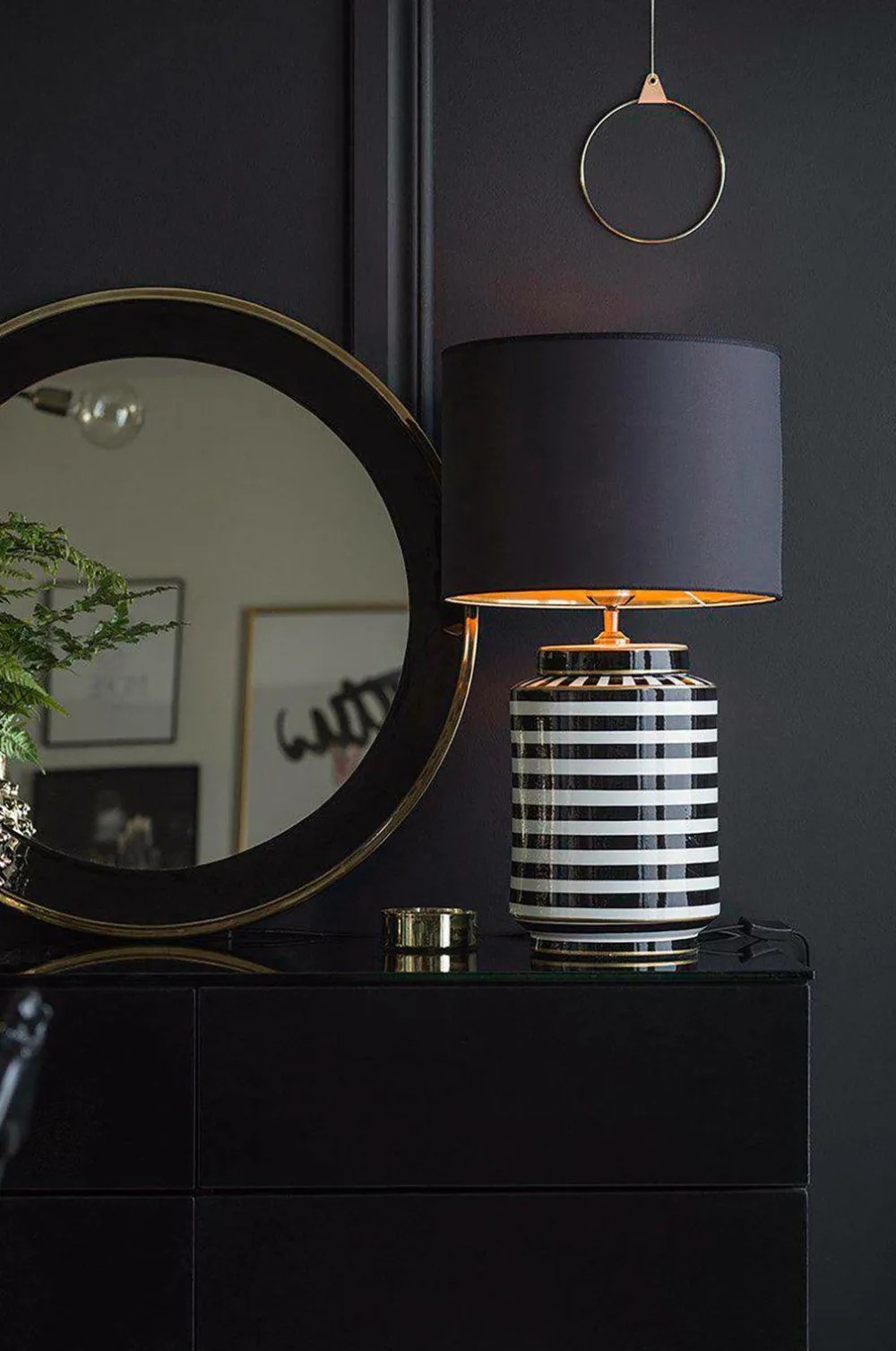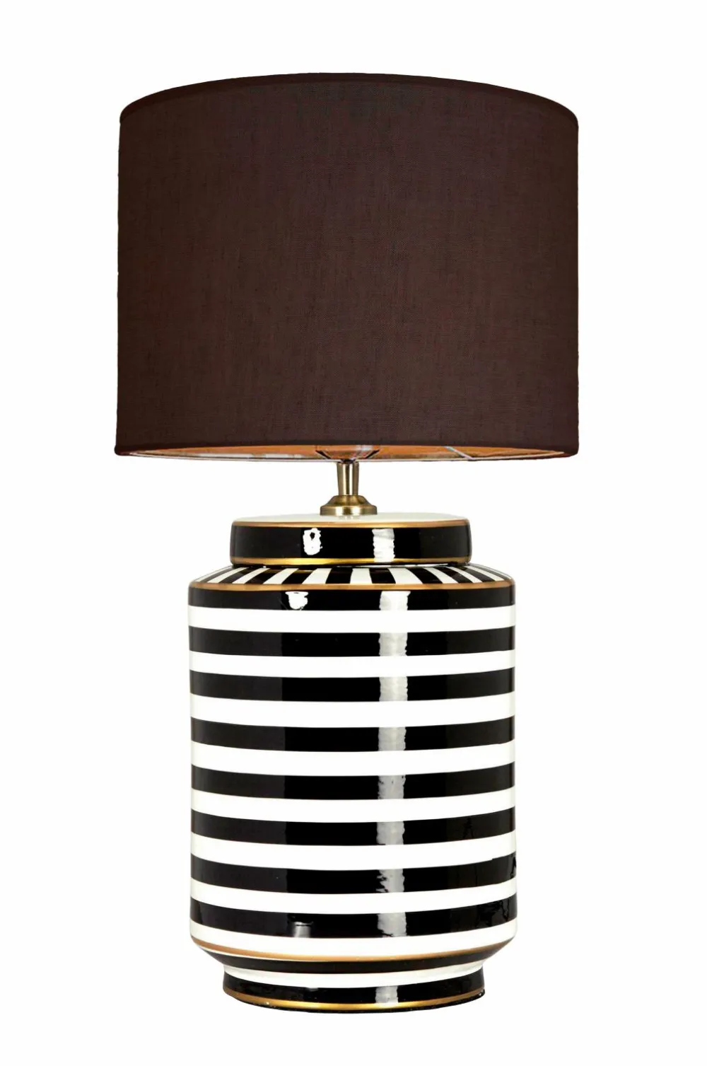En slående bordlampe med tidløs elegance – denne stribede keramikfod med et gyldent strejf giver et dristigt, men raffineret art deco-flair til ethvert rum. Den grafiske kontrast og skulpturelle form gør den lige så meget til et dekorativt objekt som en lyskilde, og den er ideel til indretninger, der hylder både historie og personlighed. Lampen måler 63 cm i højden inklusive skærmen, og diameteren på den cylinderformede skærm er 35 cm i diameter, hvilket giver en afbalanceret silhuet, der fungerer smukt på et sidebord, en konsol eller i vindueskarmen. Den har en e27-fatning (maks. 40w) og leveres med en 180 cm lang sort tekstilledning med europæisk stik. Afbryderen er praktisk placeret 35 cm fra basen. Lyskilden sælges separat. En lampe, der gør indtryk – raffineret, grafisk og fuld af karakter.