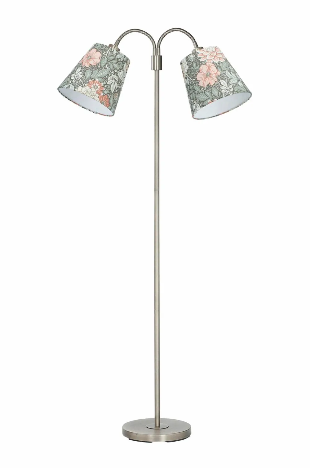 Amy gulvlampe i metal inklusive cia top fit-skærm. Skærmene har et mønster, i en rolig og beroligende farve, fra boråstapeter. Lampeskærmens mål: 20 cm i diameter forneden, 13 cm foroven og 19 cm i højden. E27 topmontering. Lampen leveres i knock-down-version og er nem at samle. Den øverste del af gulvlampen har to justerbare arme med e27-lampeholder, maks. 25w, og afbryder ved en af armene. 190 cm lang ledning med vægudtag. lyskilde købes separat. Højde 150 cm.