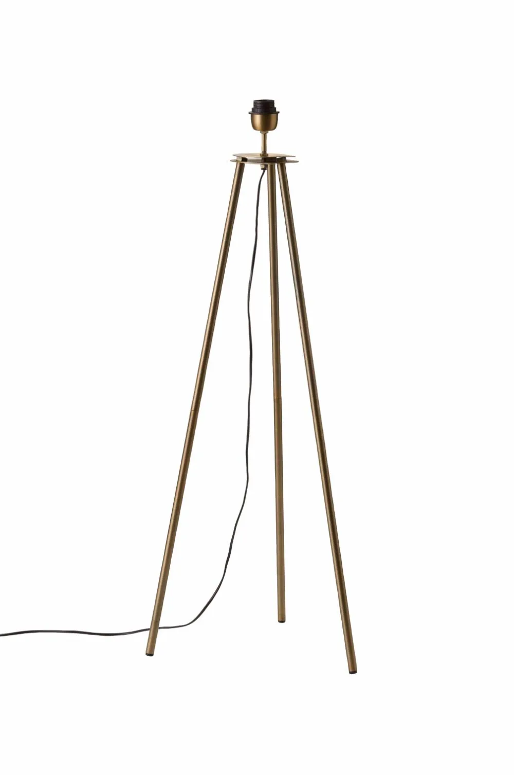 Gulvlampe base, trebenet metalstativ, såkaldt tripod, som kan kombineres med en række forskellige lampeskærme og gør den til et alsidigt og tidløst valg til dit hjem. Slået guldfinish (grovbørstet antik messing). Højde 105 cm, bund 40×40 cm. 3,4 m sort plastledning med gulvafbryder placeret ca. 130 cm fra lampeholderen. E27-fatning. Max 25w. Ip20. Lyskilde og lampeskærm medfølger ikke. Lampen kommer i en lille pakke og er nem at samle.