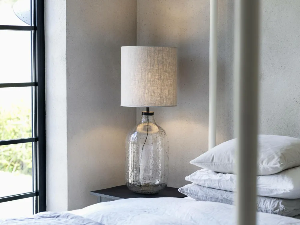 Groove lampefod er håndlavet i ufarvet glas med bobler og sandeffekter. Vi har fundet inspiration i gamle flasker for at opnå et råt look og hver enkelt lampe er unik. Sorte metaldetaljer og 2 meters sort ledning. Højde 40 cm, Ø 16 cm. Fatning E27. Maks. 40 W. Pære medfølger ikke.