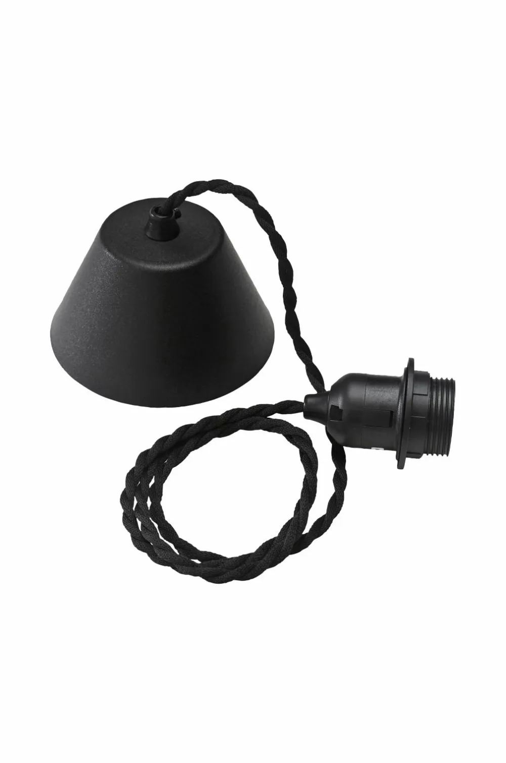 Loftophæng med snoet stofledning, 1,2 meter lang, E27 fatning med bærering, baldakin i samme farve og en koblingsplint. Loftkontakt medfølger ikke.