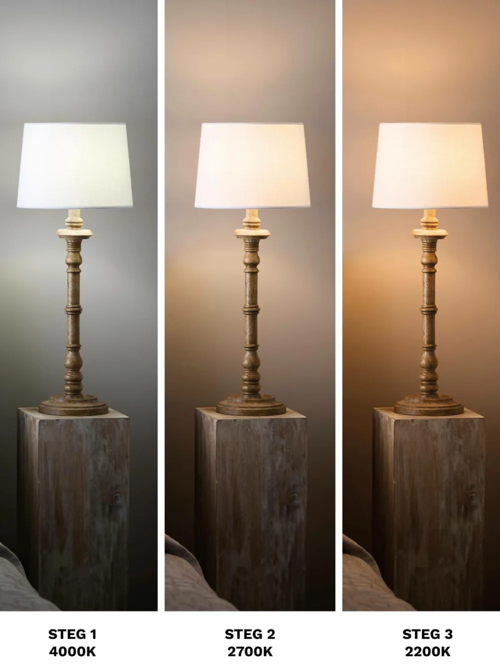 Dæmpbar LED-pære 4,5W i opal glas med 3-trins hukommelsesfunktion til skift af farvetemperatur i intervaller: 2200K. 2700K. 4000K. Lysniveauerne ved hvert valgt farvetemperatur kan desuden dæmpes.