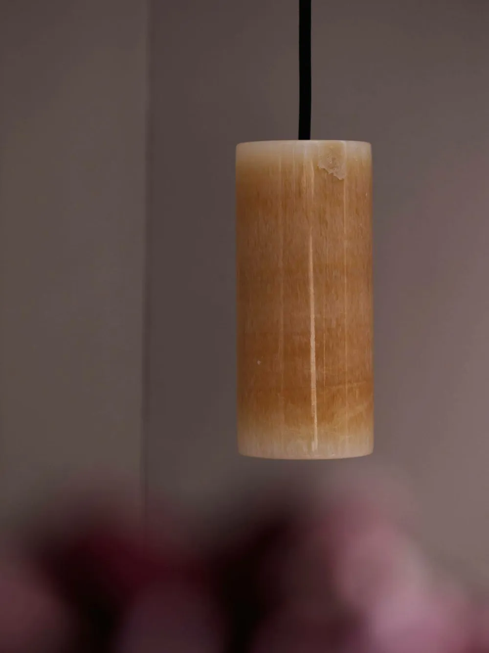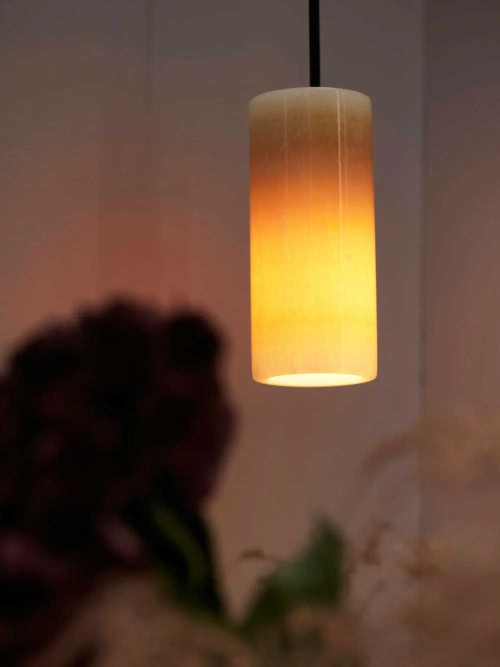Pendel i marmor med E14-fatning. 4 m sort stofledning og stik. Når lampen er tændt giver den en varm og behagelig farve. Mønstret i materialet kan variere noget, eftersom marmor er et naturmateriale. Diameter 7 cm. Højde 15 cm.