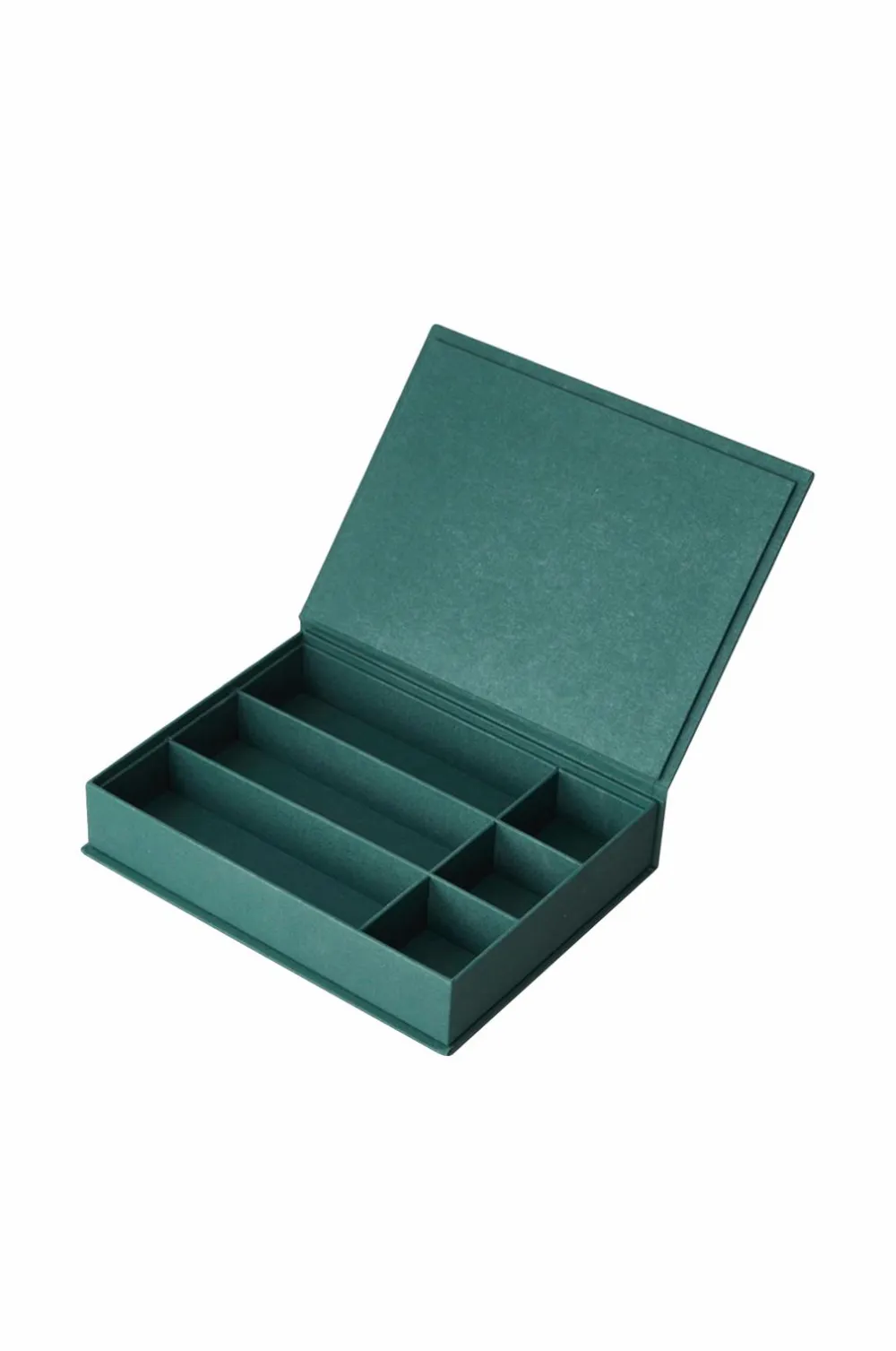 Oplev vores opbevaringsbokse – et nyt niveau af organisering, der problemfrit løfter dit hjems indretning. Når æsken er lukket, ligner den en elegant sofabordsbog, mens den indeni har seks rum (tre store og tre små) til at holde orden på dine vigtigste ting som nøgler, smykker, kuglepenne og hovedtelefoner. Når du holder dine ejendele pænt gemt væk, fungerer disse æsker også som en stilfuld indretningsdetalje. Æskerne er beklædt med stof med folieprint og fås i grøn, orange, grå eller pink, så de passer til din smag og løfter din indretning uden besvær.