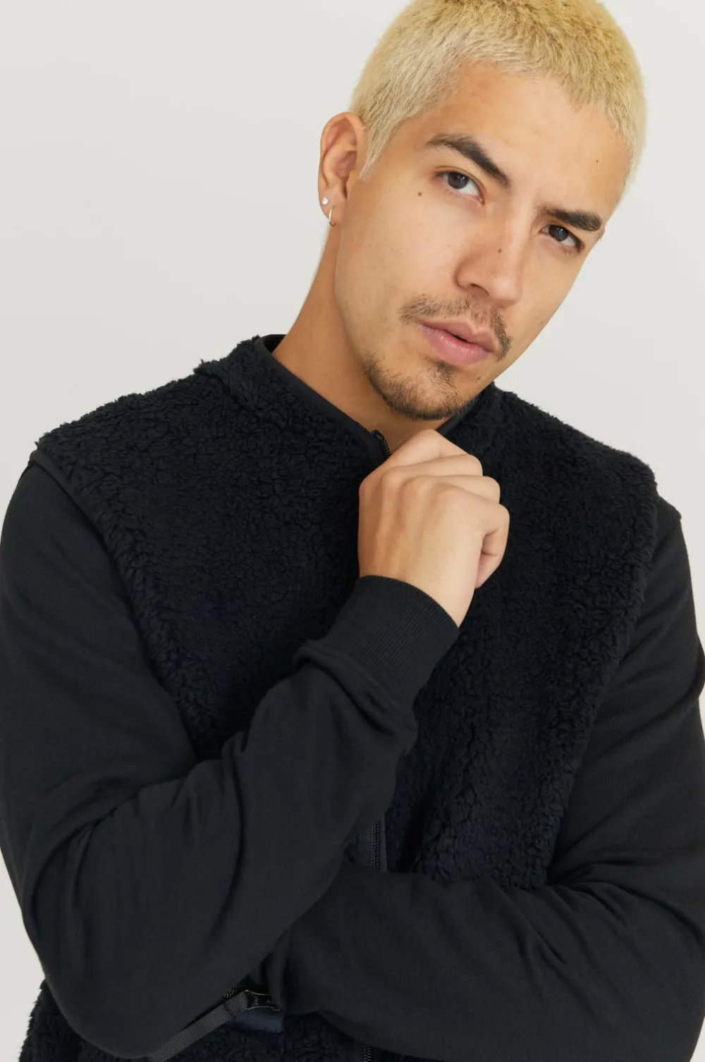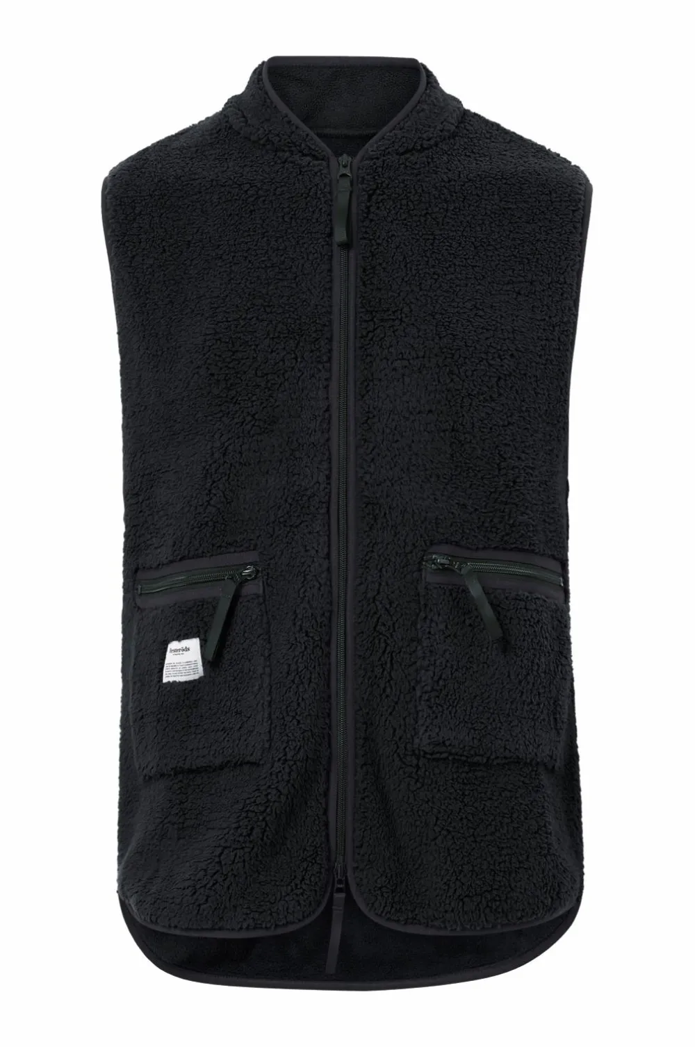 Klassisk fleecevest med lynlås og to lommer med lynlås. Længere bagpå. med afrundet kant forneden.
