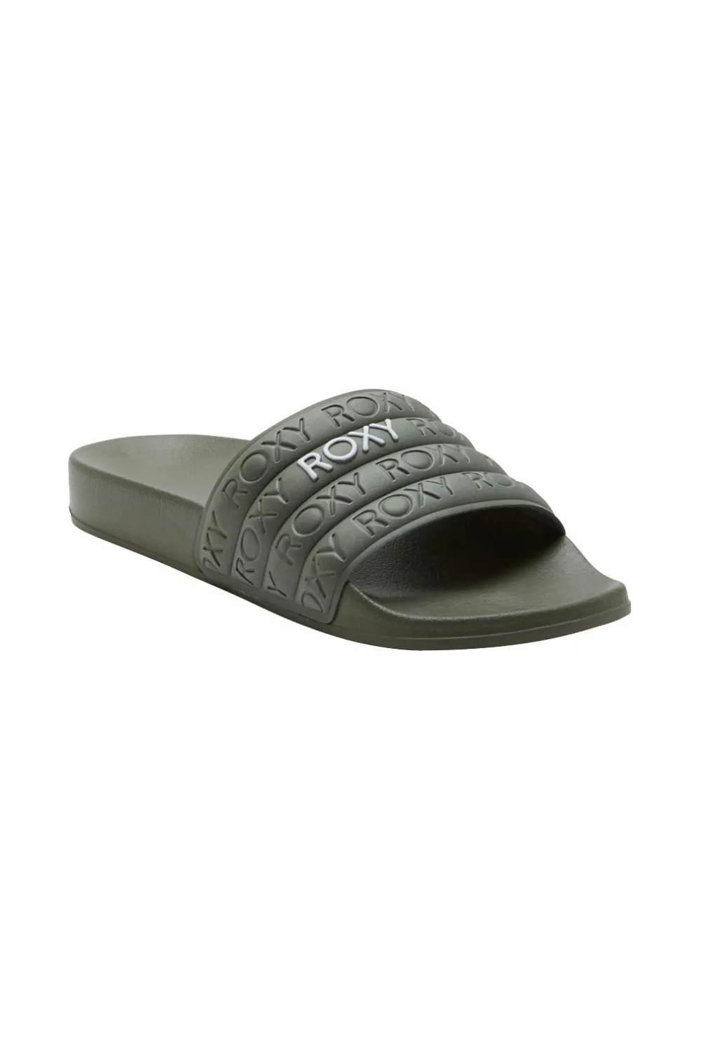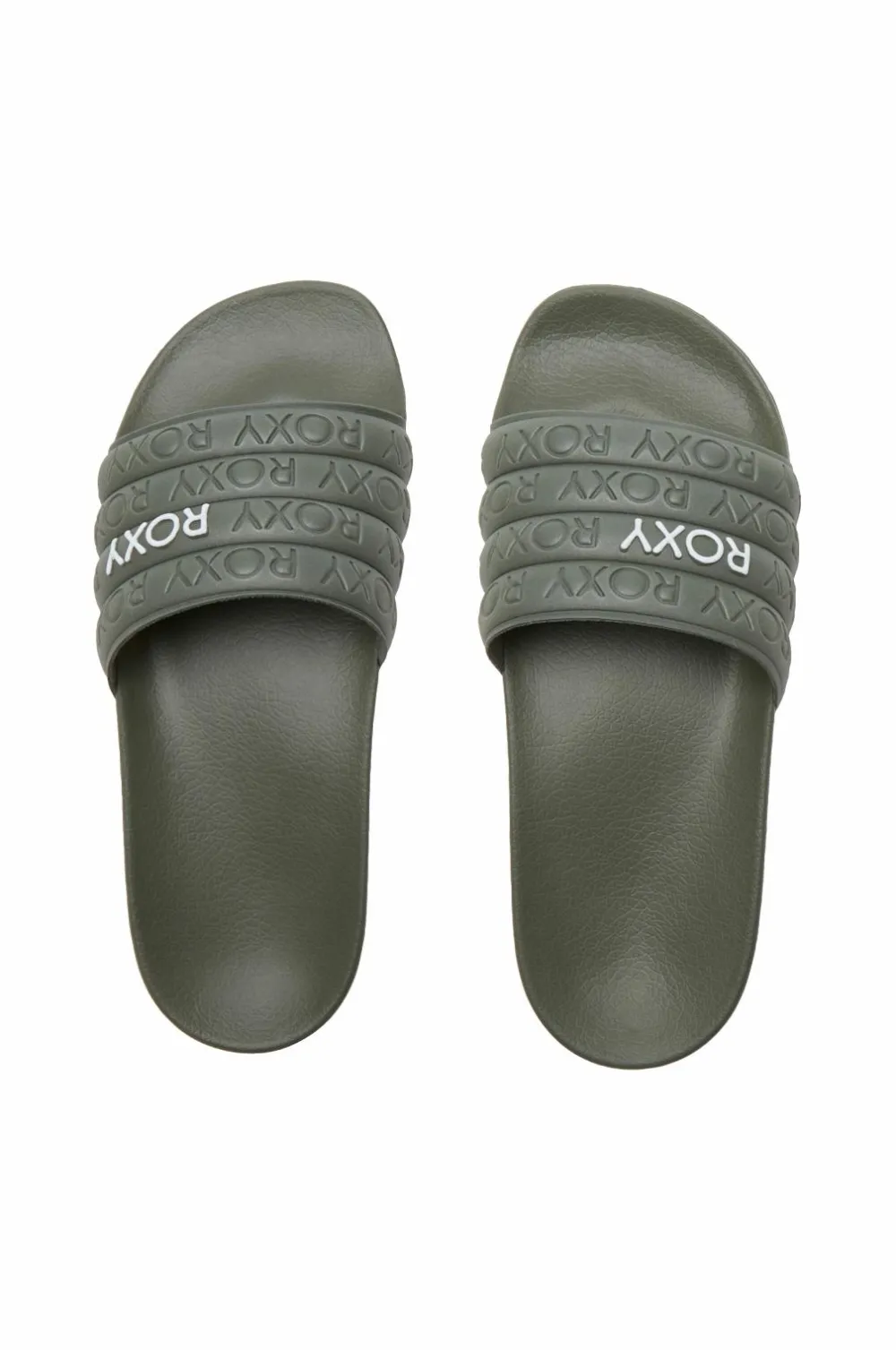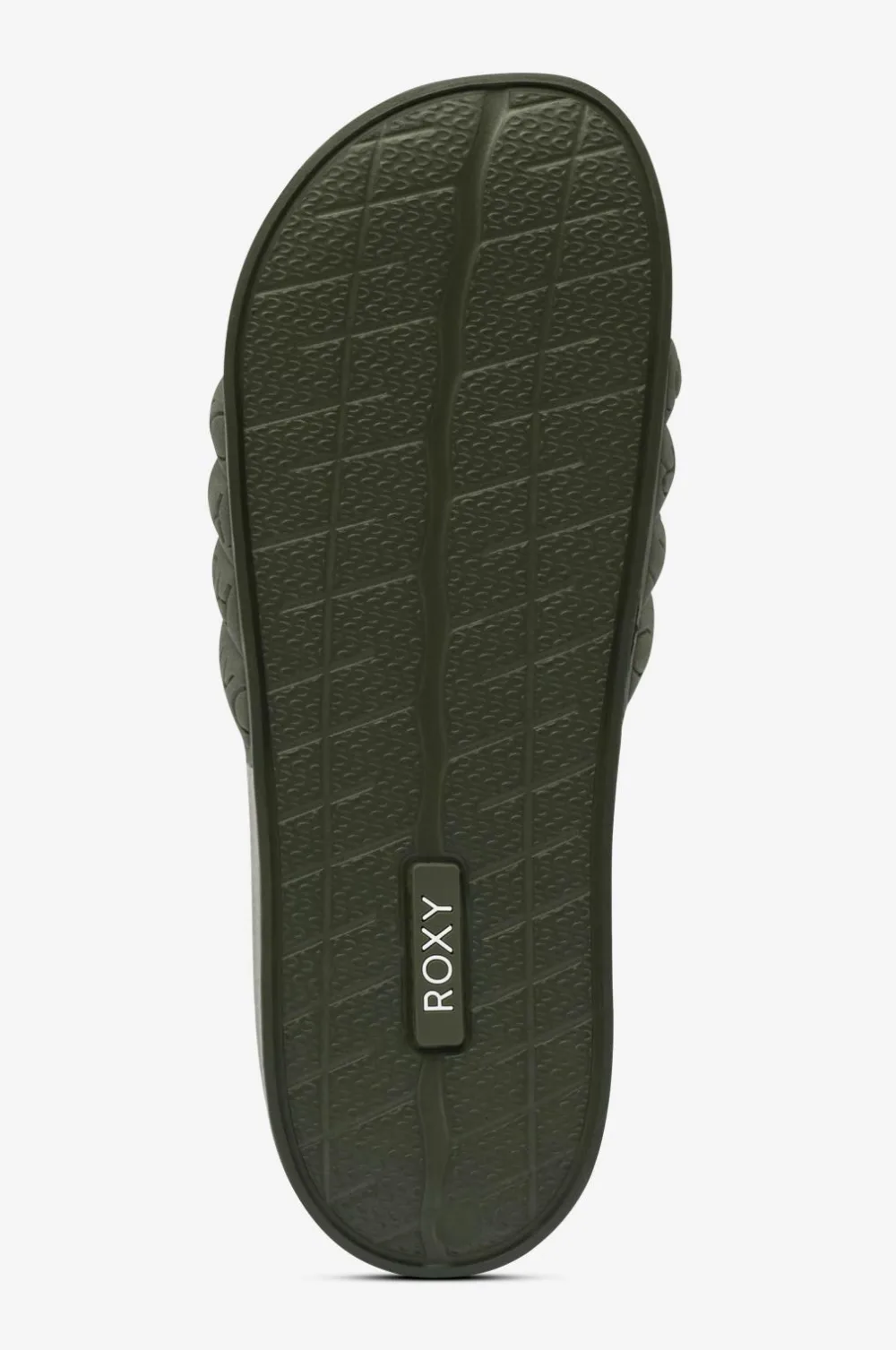 Badetøfler med bred rem over foden med blødt tekstilfor. Præget Roxy-logo på oversiden. Fodformet fodseng for komfort.