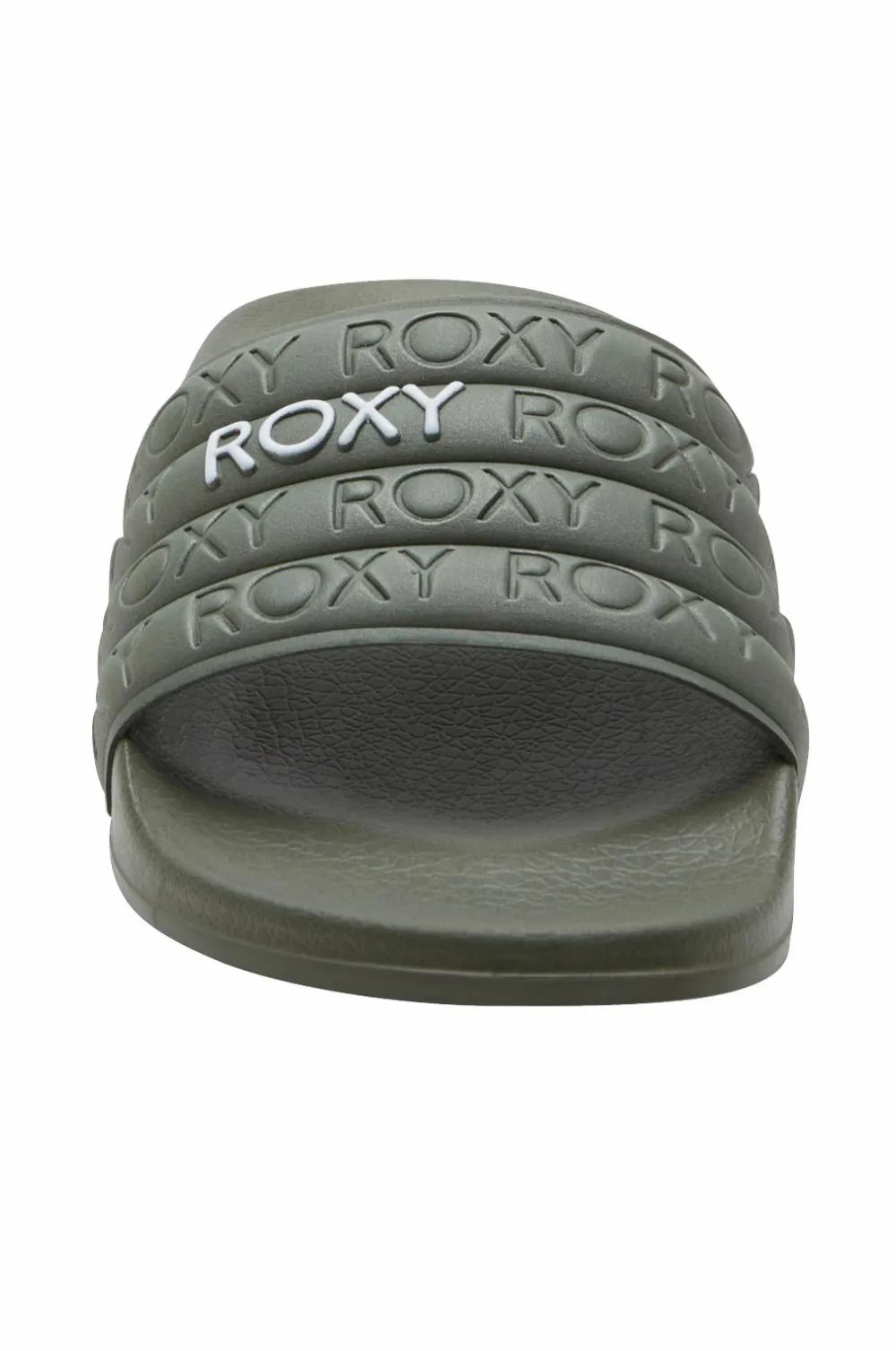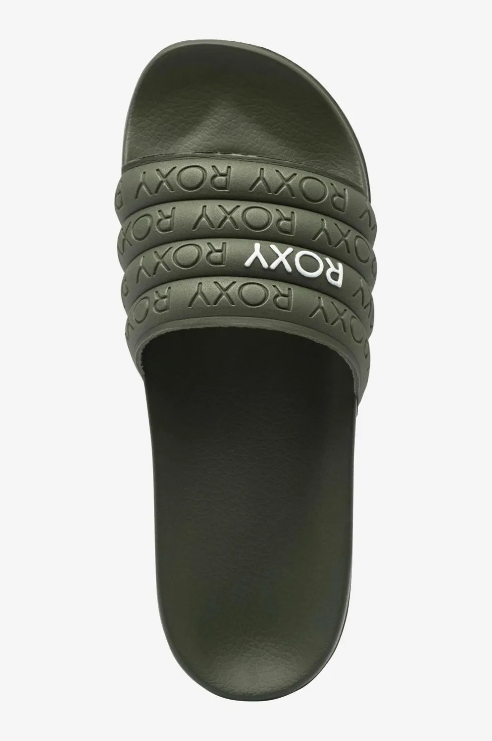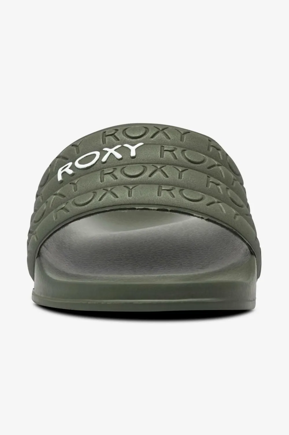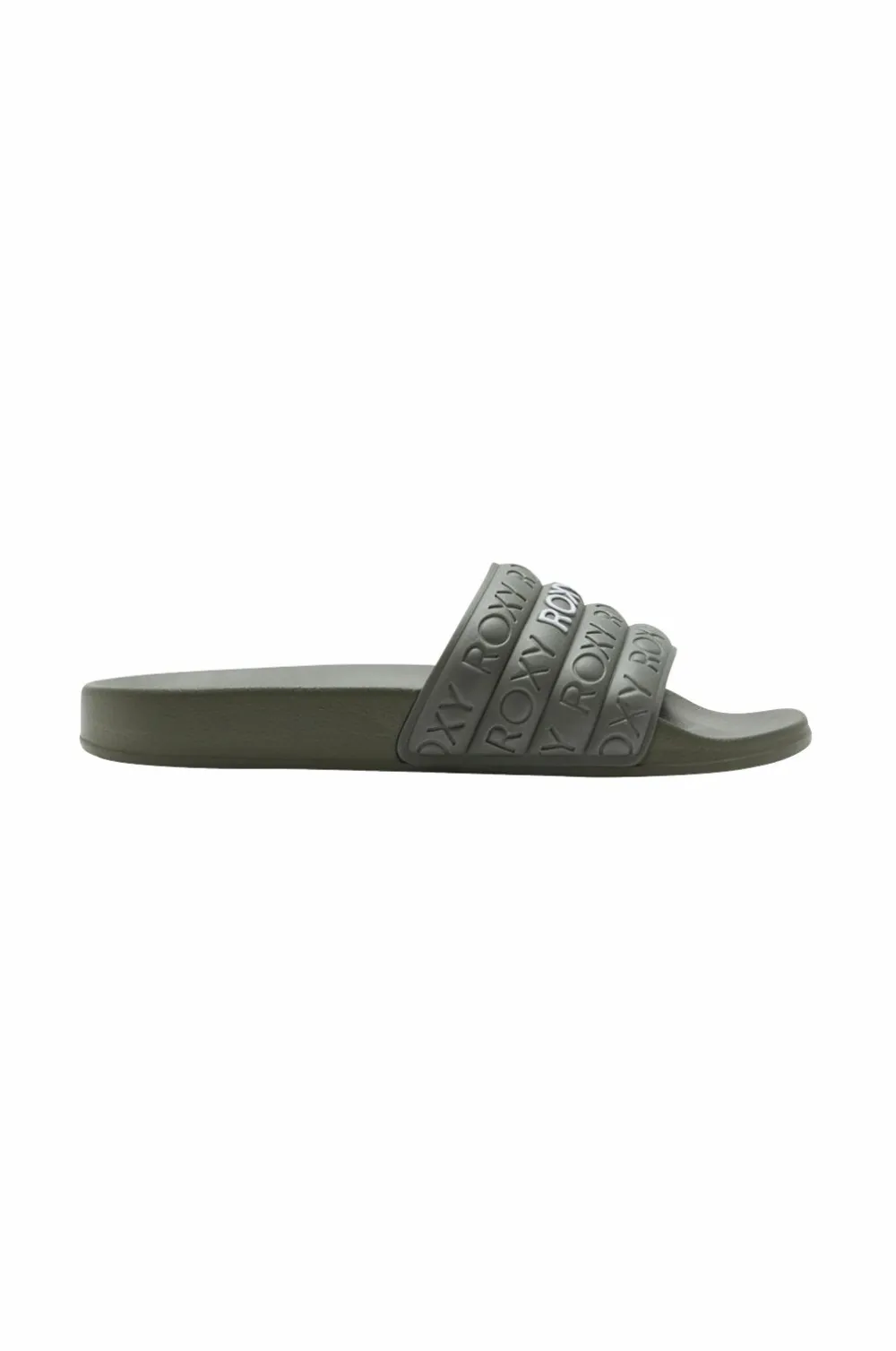 Badetøfler med bred rem over foden med blødt tekstilfor. Præget Roxy-logo på oversiden. Fodformet fodseng for komfort.