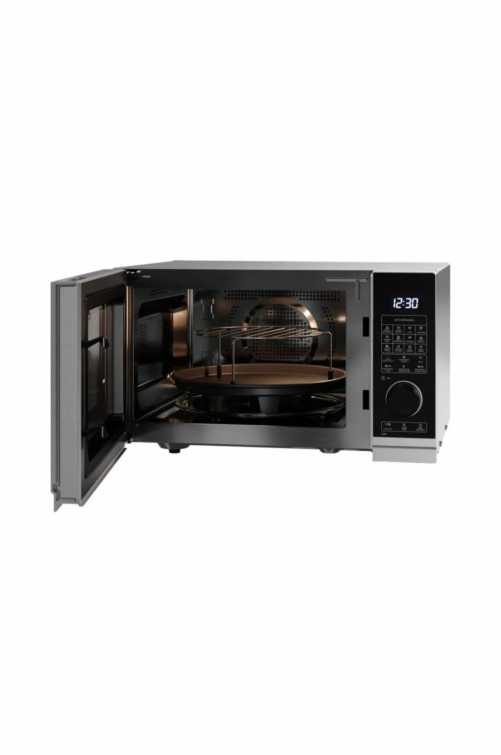Roterende tallerken, 10 effekttrin, 14 forudindstillede programmer og optøning med vægtindstilling. Den er desuden udstyret med timerfunktion og børnesikring.