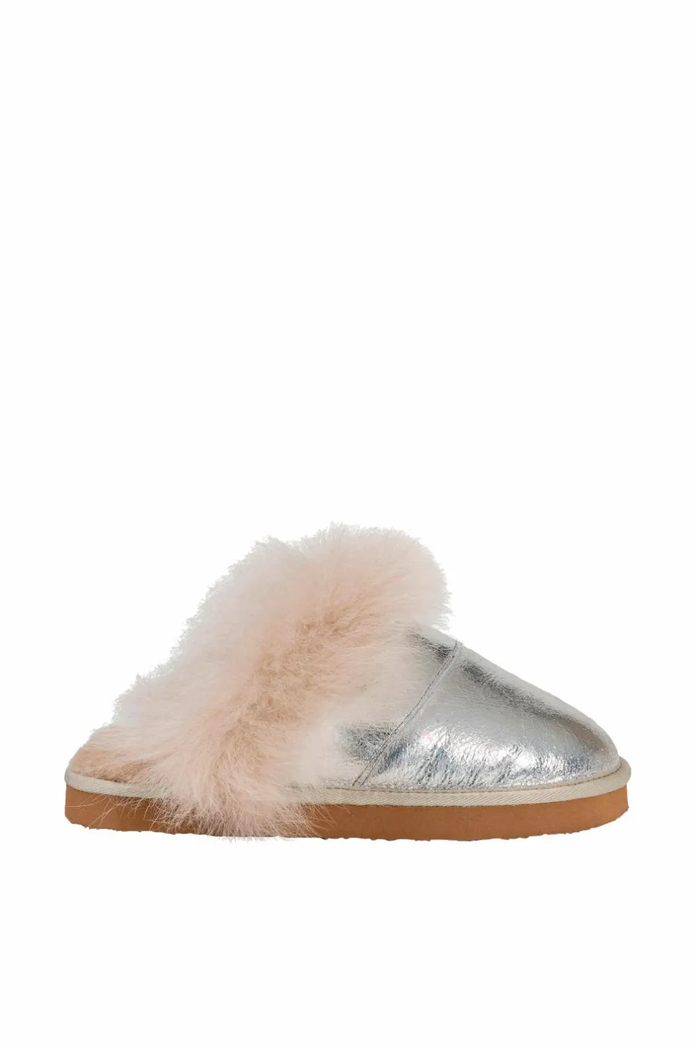 Shepherd Eve. Et par fåreskindsko med en bred krave af langhåret fåreskind. Besætning af stof. Ydersål af gummi. Sålhøjde 2 cm.