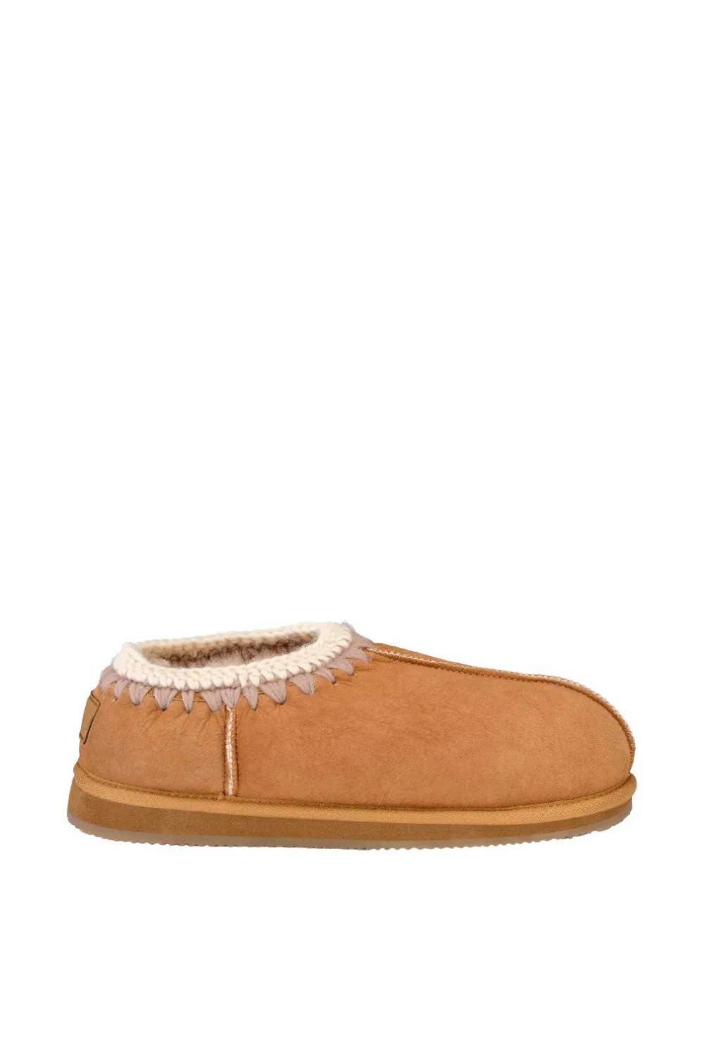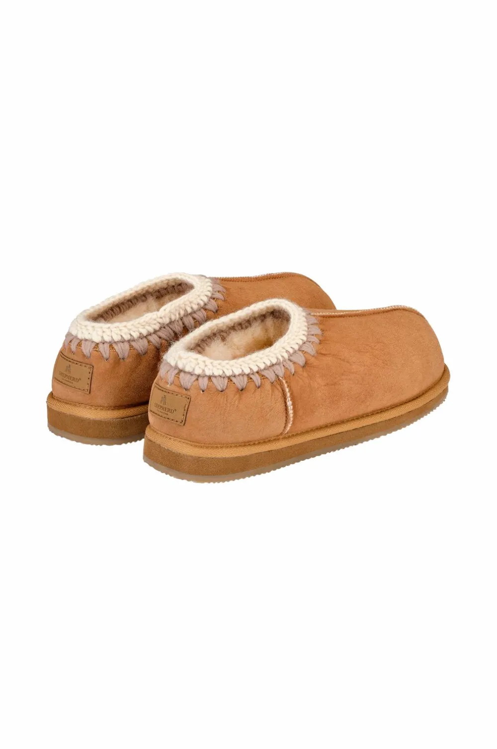 Shepherd Izzy. Et par sko af fåreskind. Broderet søm øverst og stofkant. Ydersål af gummi. Sålhøjde 2 cm.