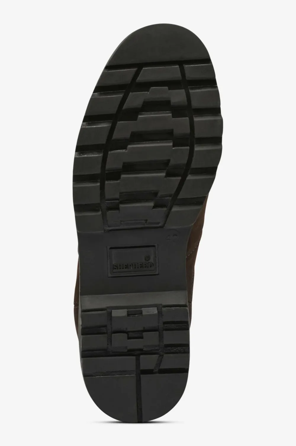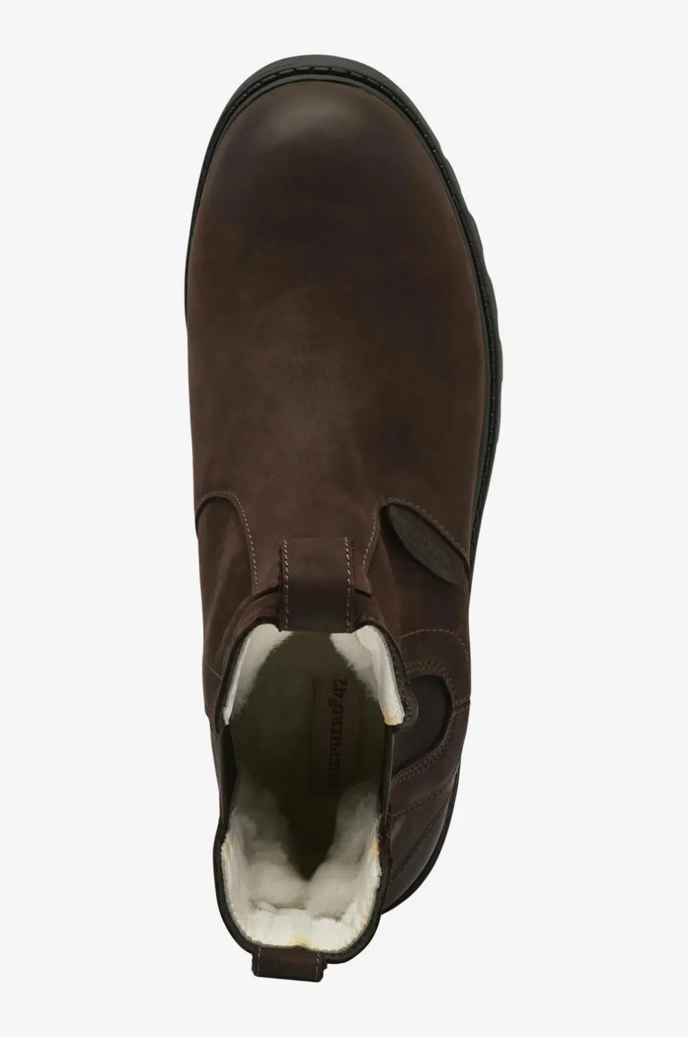 En meget velforarbejdet chelseaboot i fin kvalitet med varmende fåreuld i hele støvlen. Overdelen er i nubuck, som er et slebet skind med mat overflade. Elastikkile på begge sider af åbningen. Trækstrop foran og bagpå i skaftkanten. Grovmønstret sål med godt greb. Rund tå. Skafthøjde bagpå ca. 15 cm. Hælhøjde ca. 3 cm.