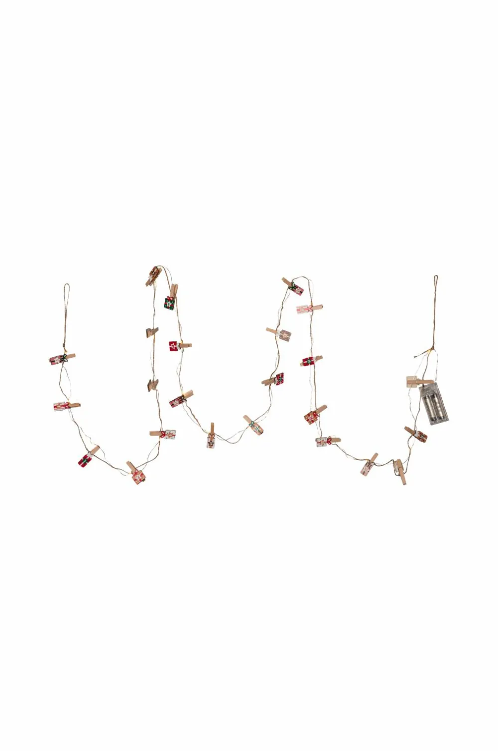 Dekorativ lyskæde i tynd sølvfarvet metaltråd med 24 træklemmer, malet i julefarver og markeret med tallene 1 – 24. Perfekt til nedtællingen til juleaften. 24 varmhvide lysdioder, der giver et behageligt skær. Lyskæden drives af 2 aa-batterier, timerfunktion i batteriboksen, til indendørs brug.