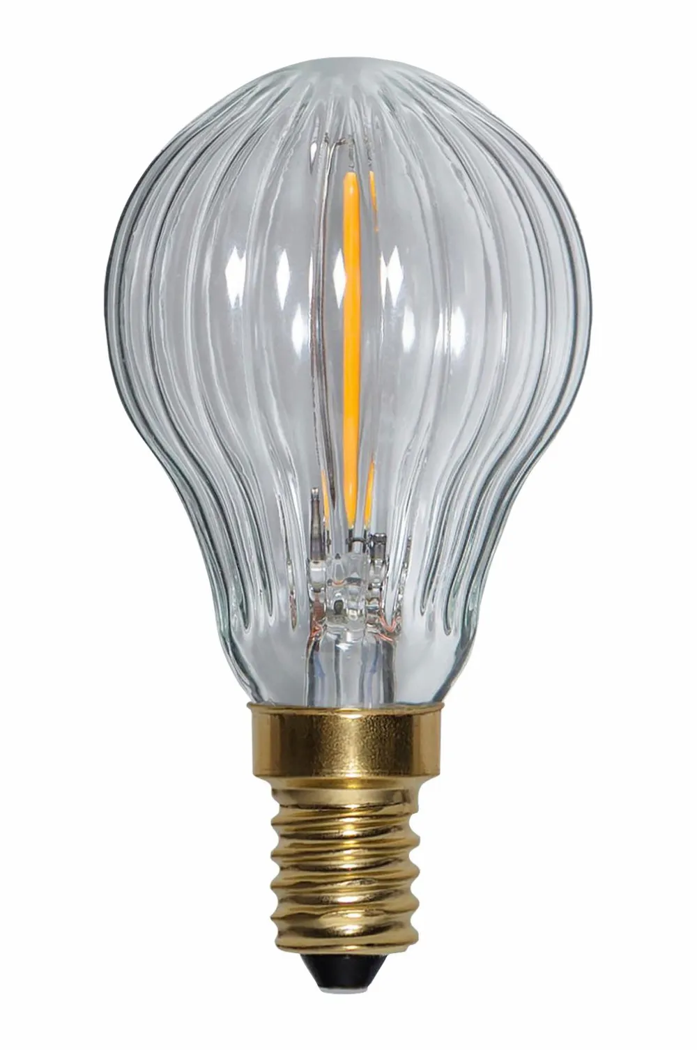 Dekorativ led-lampe med en varm og blød glød. Farvetemperaturen er 2200k. Pæren er kompatibel med lysdæmper og har en e14-fatning. Det stribede glas giver et smukt lys. Pakke med 7 stk.