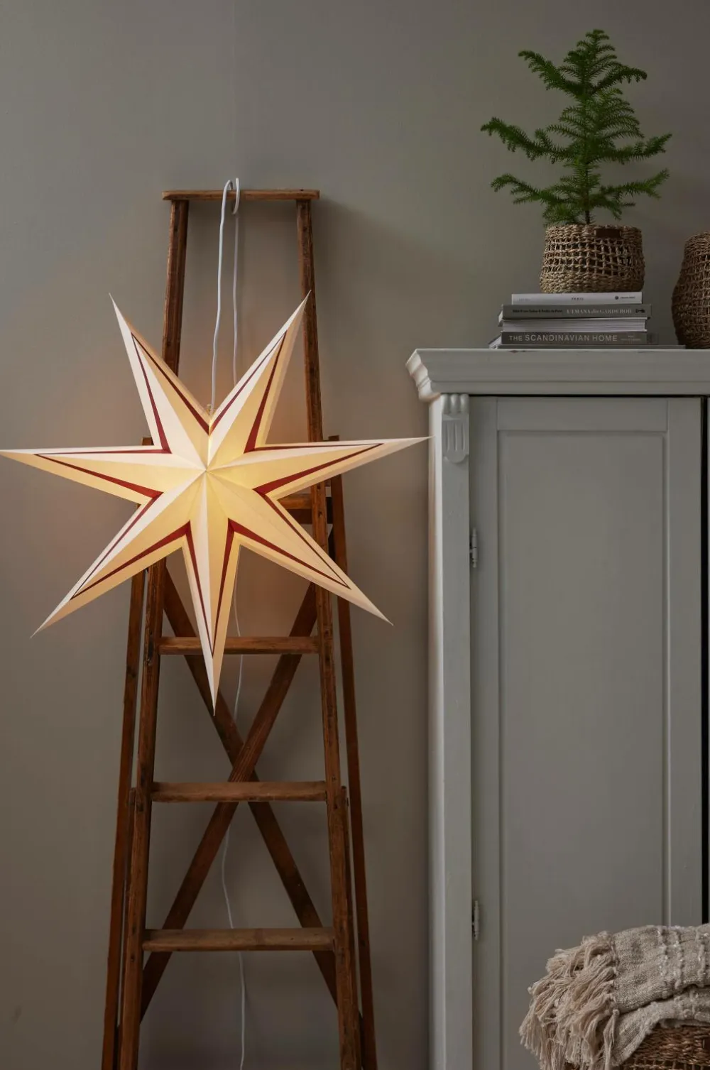 Stribet stjerne lavet af papir. Klassisk hvid stjerne med striber. Pynt op til advent, og det vil give en vidunderlig julestemning. Køb et ledningsstativ og en lyskilde til at lyse stjernen op.