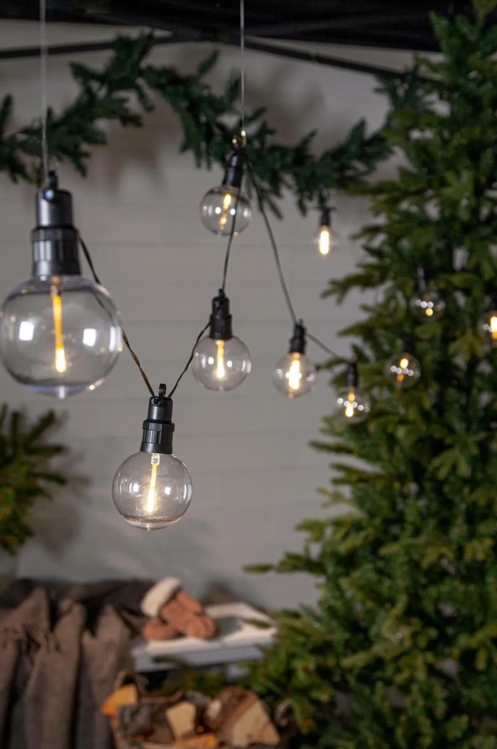 Lyskæde til udendørs brug, 10 klare kugler på 8 cm i diameter med en glødetrådsstang med flydende lyseffekt, varmt hvidt skær, der giver et behageligt lys. Velegnet til både hverdag og fest. Sort kabel med 50 cm mellem hver kugle.