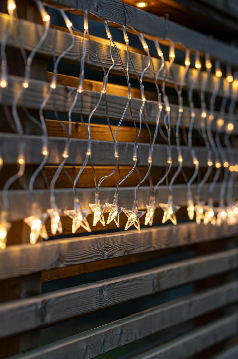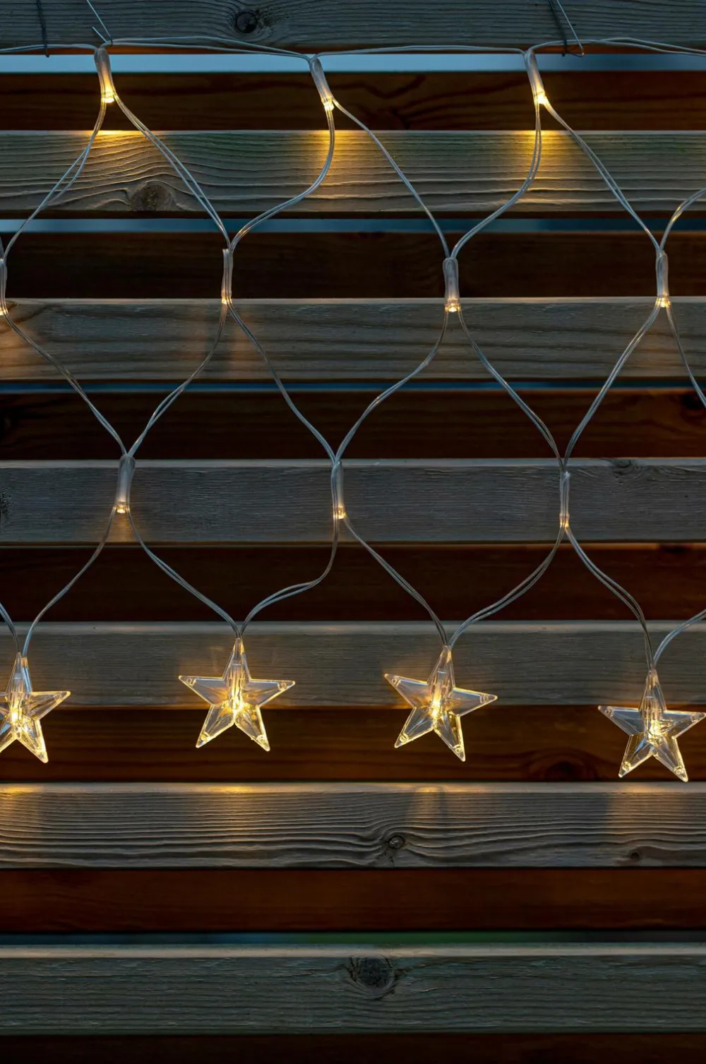 Lysnet i transparent kabel, størrelse 4,8×0,4m. I bunden hænger 40 stjerner, i alt har nettet 160 varmhvide lysdioder, der giver et smukt skær. Ip44-klassificeret transformer med 5 meter startkabel. Lys f.eks. altanen, husmuren eller taget op med dette dekorative net.