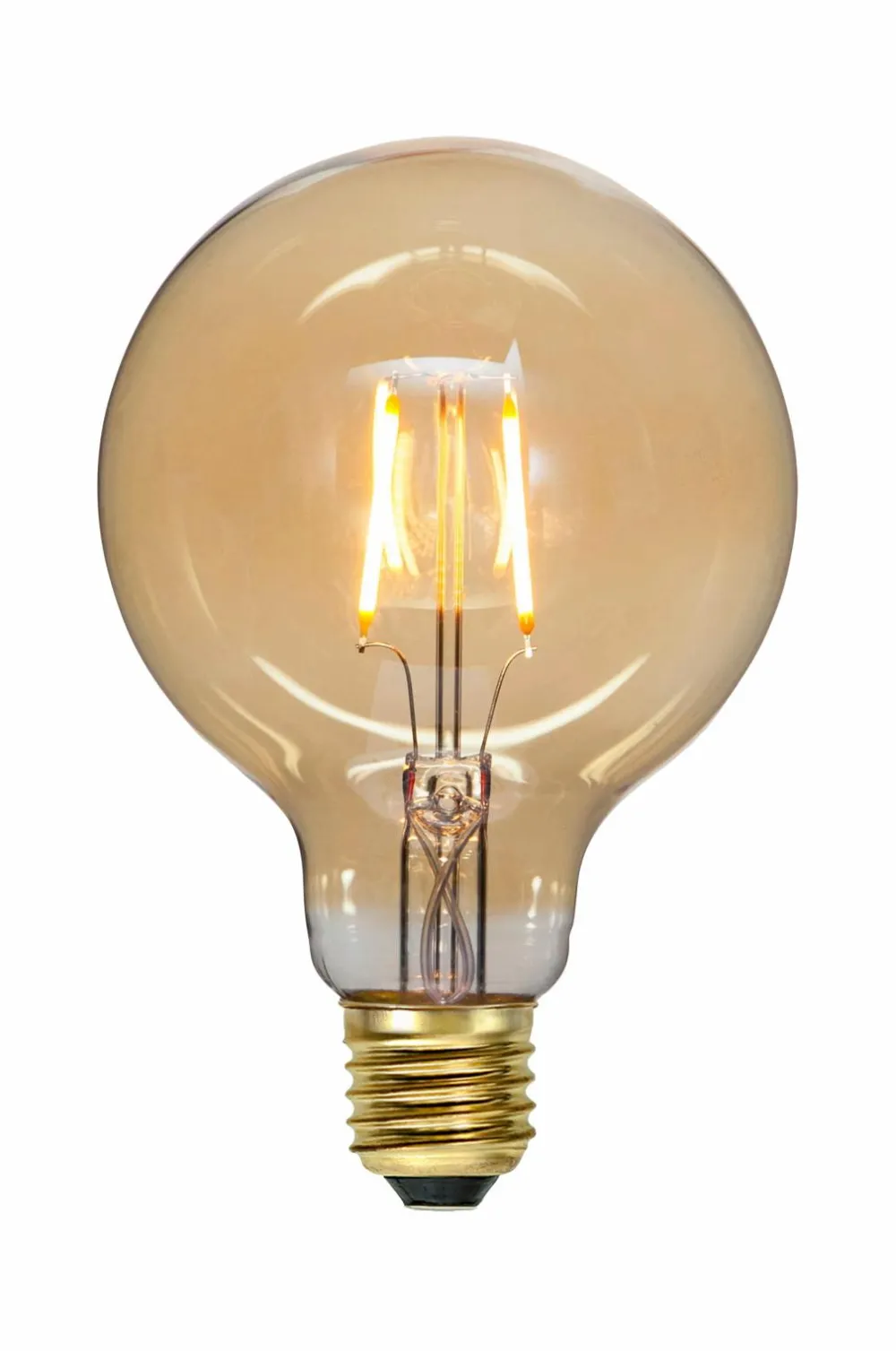 80 mm dekorativ led-lampe i ravfarvet glas med et varmt hvidt skær. Hætte: e27. Farvetemperaturen er 2000k og lysstrømmen 80lm.