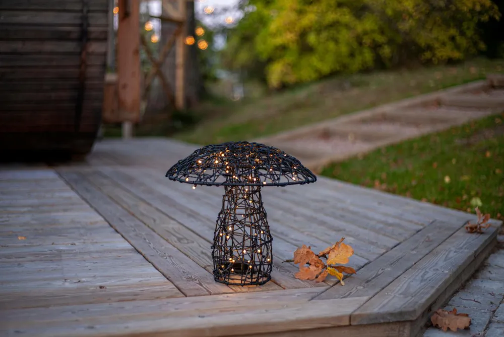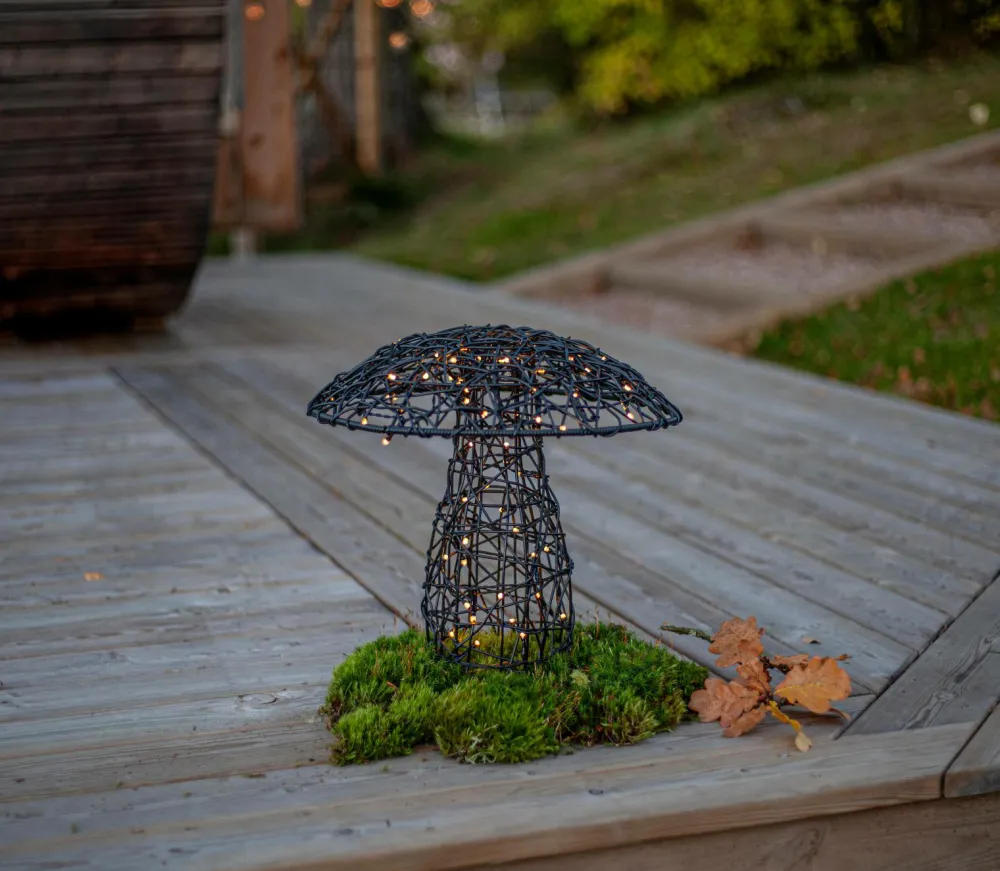 Batteridrevet udendørs dekoration i form af en svamp, 34 cm høj. Fremstillet af sort rattan med metalramme. Batteriboksen drives af 3 stk. aa-batterier (medfølger ikke). En smuk dekoration til terrassen og haven.