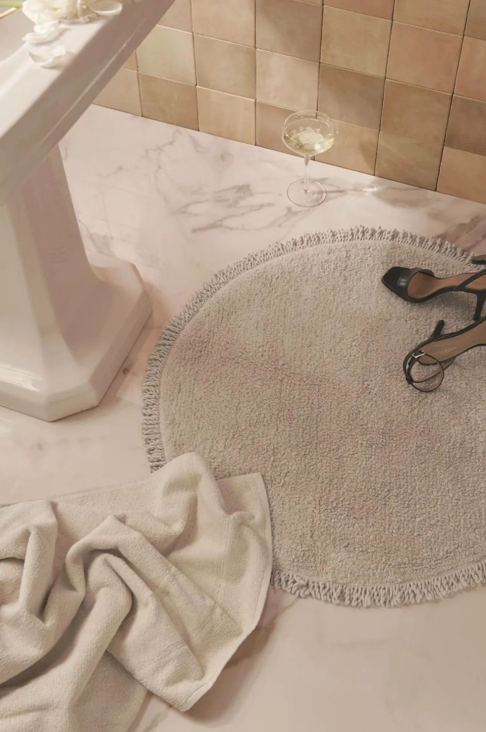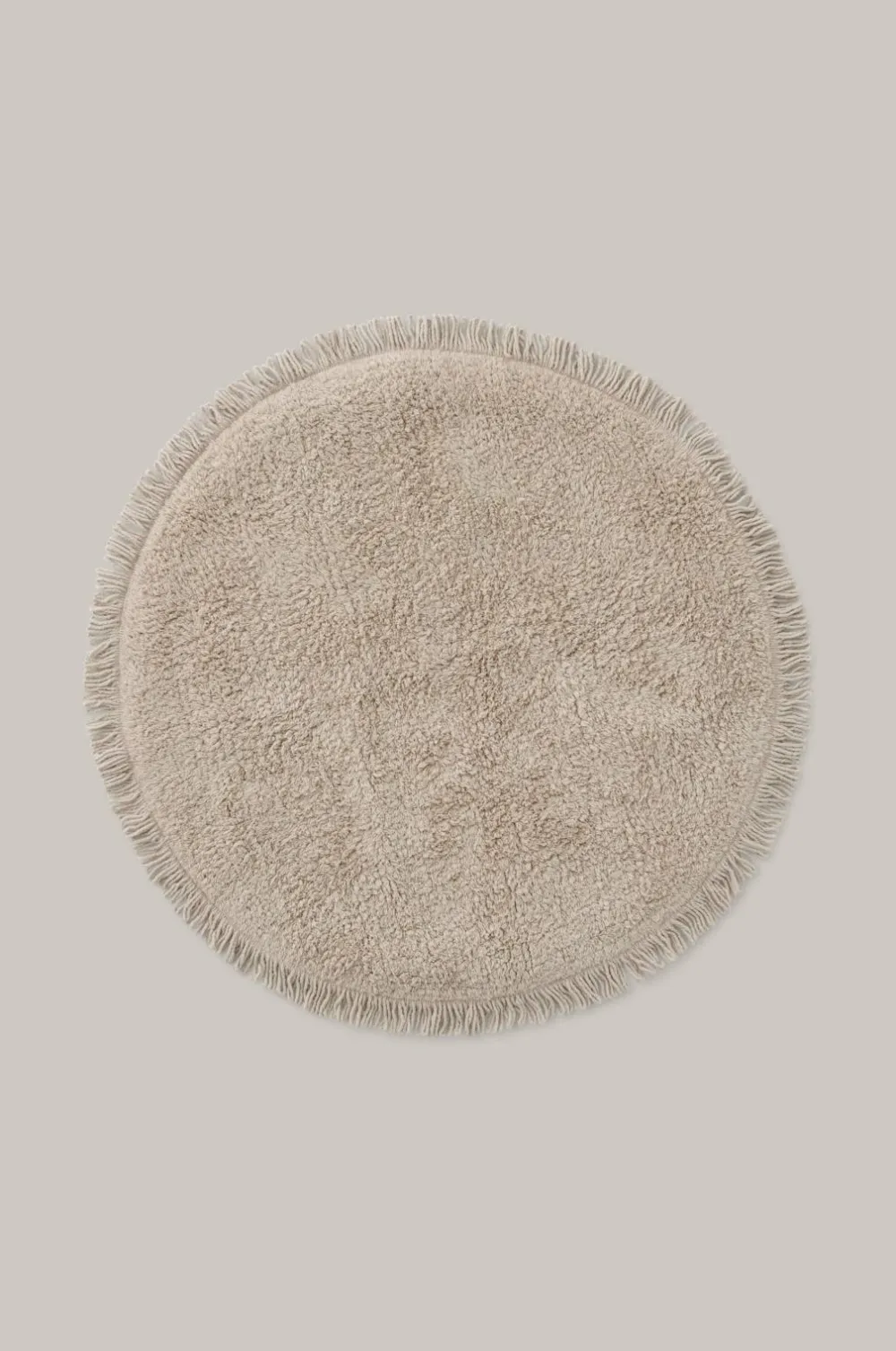 Rund, tuftet badeværelsesmåtte med frynser i kanten. Diameter 70 cm.