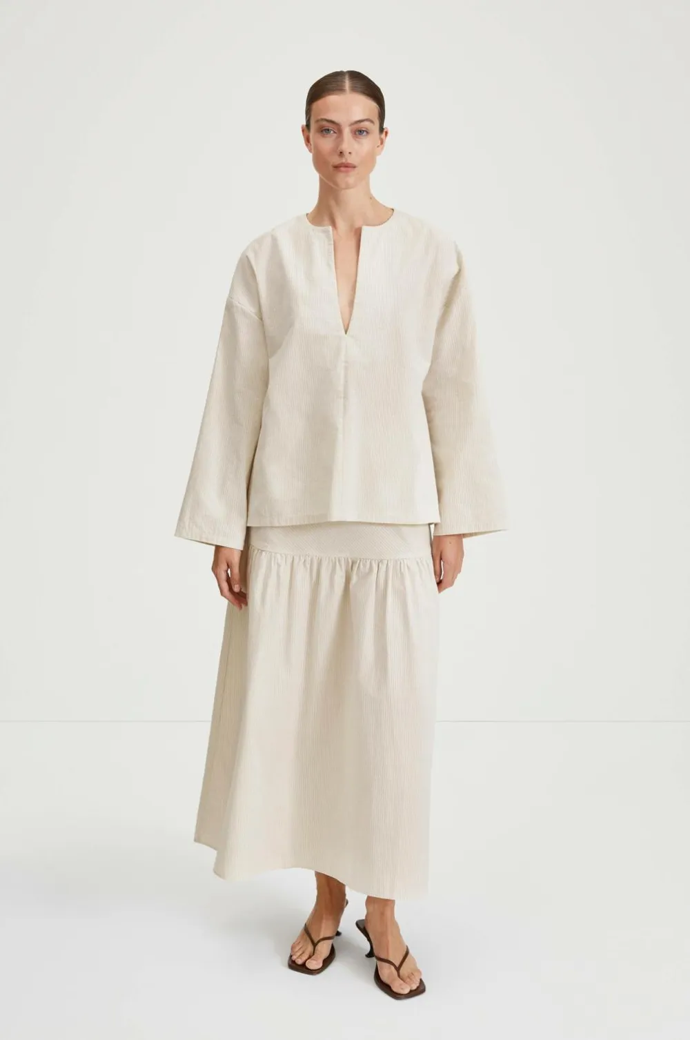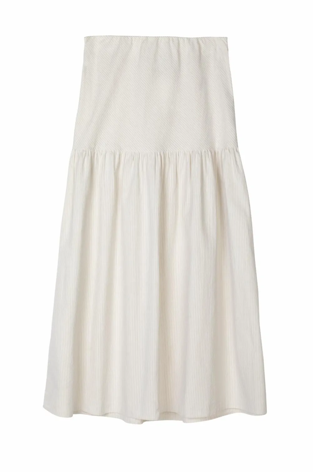 Denne nederdel er lavet af struktureret bomuldsseersucker og falder til ankelhøjde med en blød, flydende form. Den nederste del af nederdelen blusser ud og giver en struktureret, men alligevel flydende silhuet.