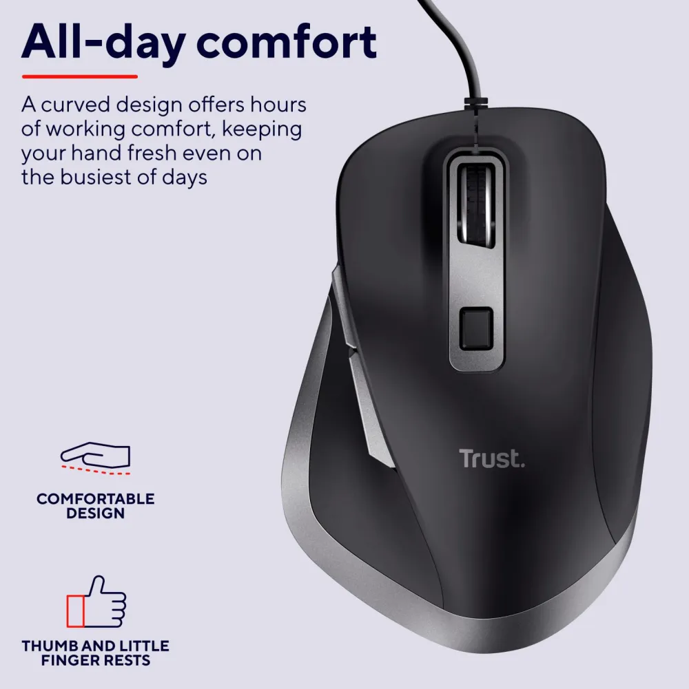 Computermus med buet design for komfort og med 6 lettilgængelige knapper – du har altid fuld kontrol.