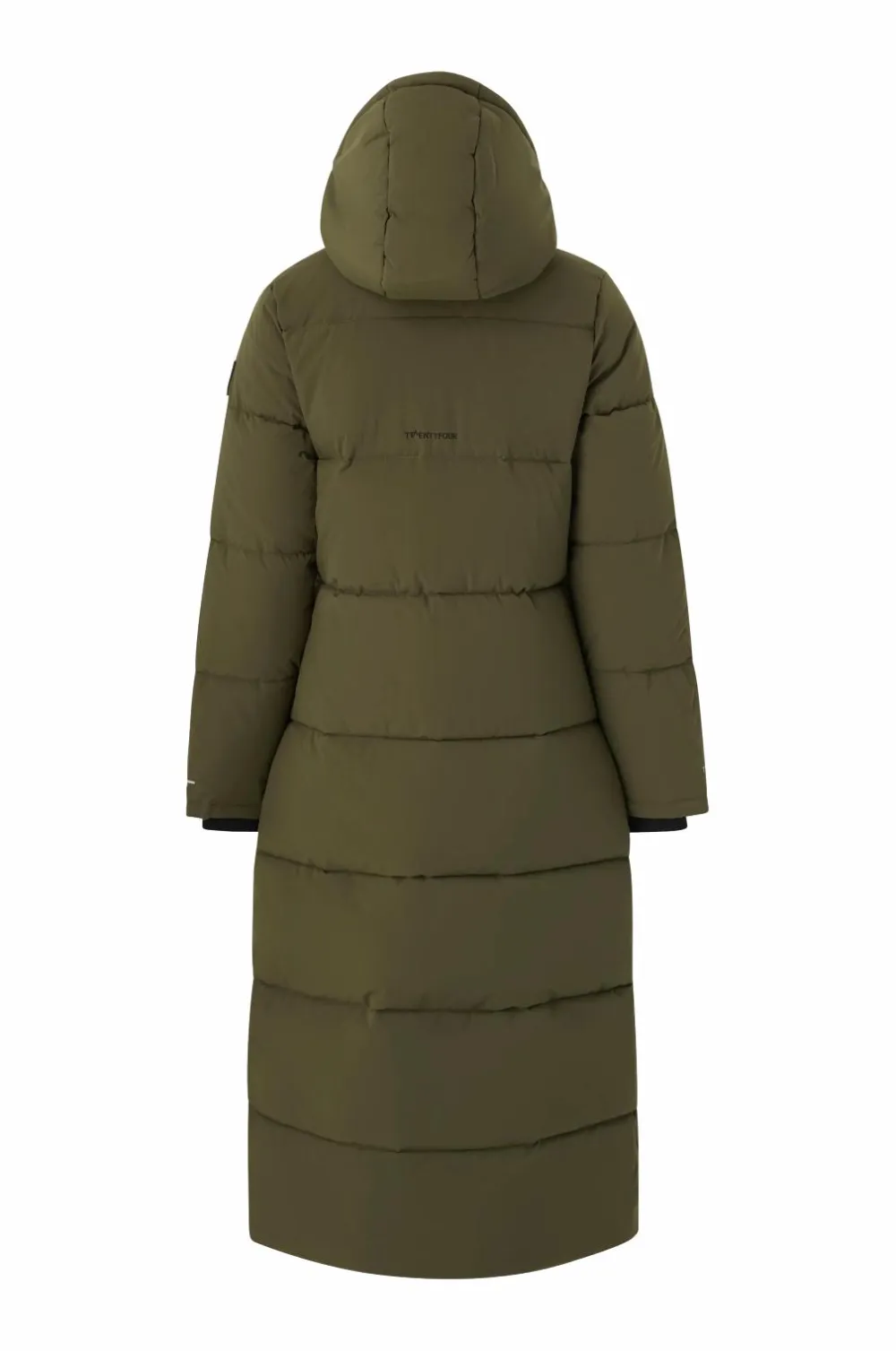 En lang parka med fast hætte i et blødt og mat materiale. Den er fyldt med et genanvendt og løst fyld, som giver en meget let og varm polstring.