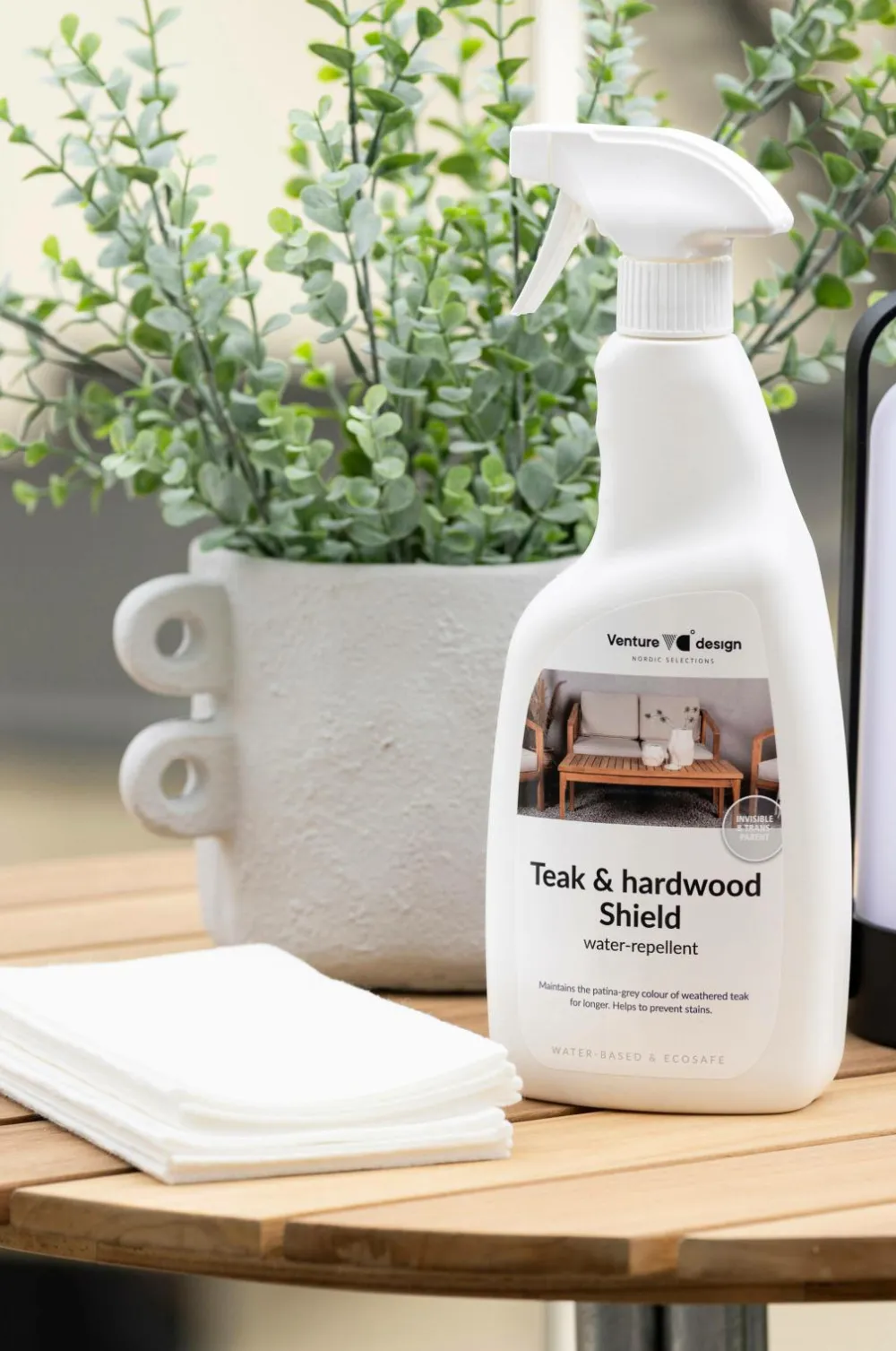 Havemøbler udsættes for stor belastning under sæsonens forskellige vejr- og temperaturændringer, som nedbryder materialets naturlige beskyttelse. Denne beskyttelse gør teaktræ og andre hårdttræer vand- og smudsafvisende og hjælper med at forhindre pletter og skimmelsvamp, der kan opstå fra snavs og fugt. Beskyttelsen giver dine møbler en længere levetid og er med til at forhindre, at møblerne bliver beskadiget og mister sit udseende. Beskyttelsen er vandbaseret og gennemsigtig og holder op med at klæbe efter 30 minutter og er vandafvisende efter 48 timer. 750 ml.