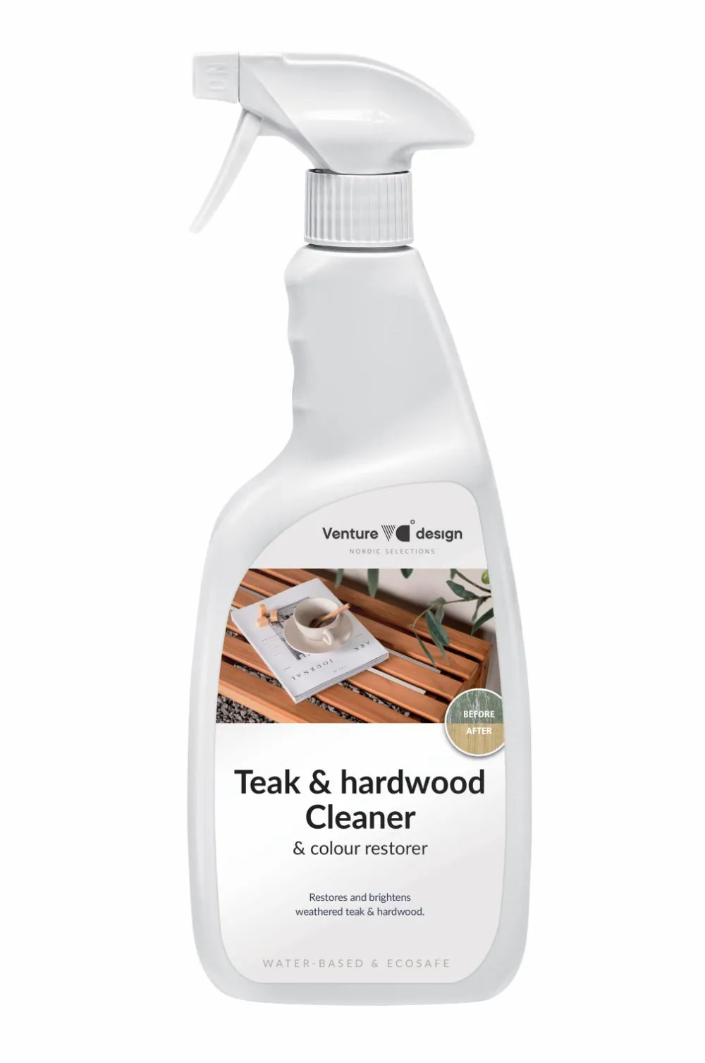 Et vandbaseret rengøringsmiddel, der nemt renser og genopretter misfarvet teak og hårdttræ og giver dine møbler en længere levetid! Farven er transparent og hjælper også med at genoprette møblerne til dens oprindelige farve. Et praktisk rengøringsmiddel, der holder op med at klæbe efter 30 minutter og er vandafvisende efter 48 timer. 750 ml.