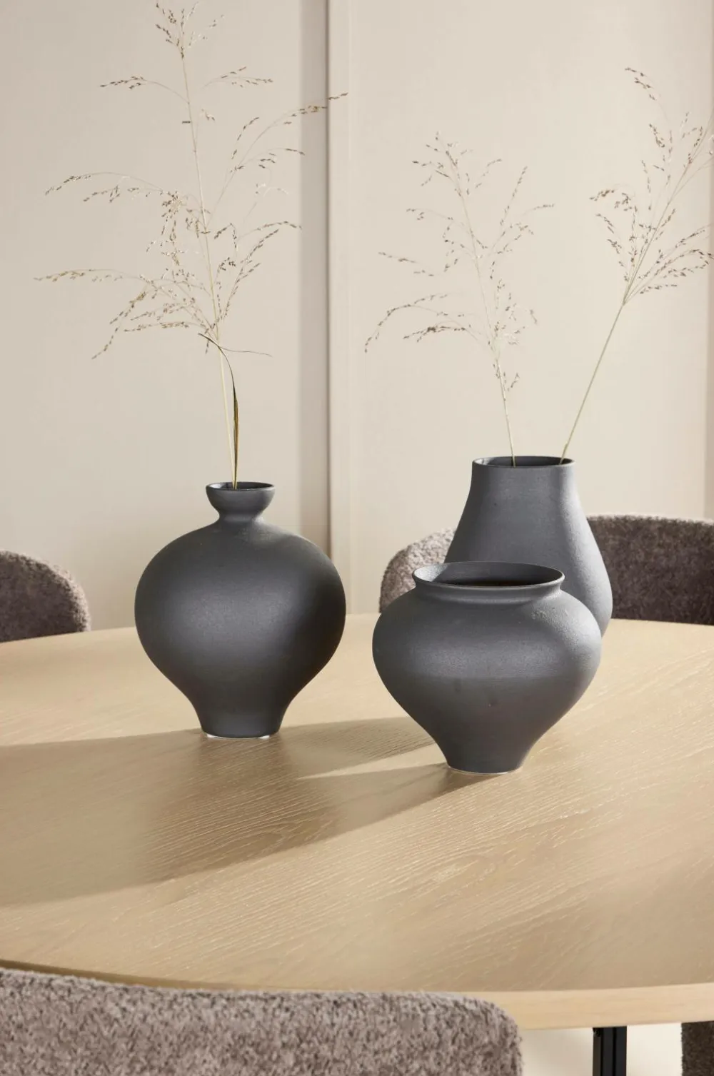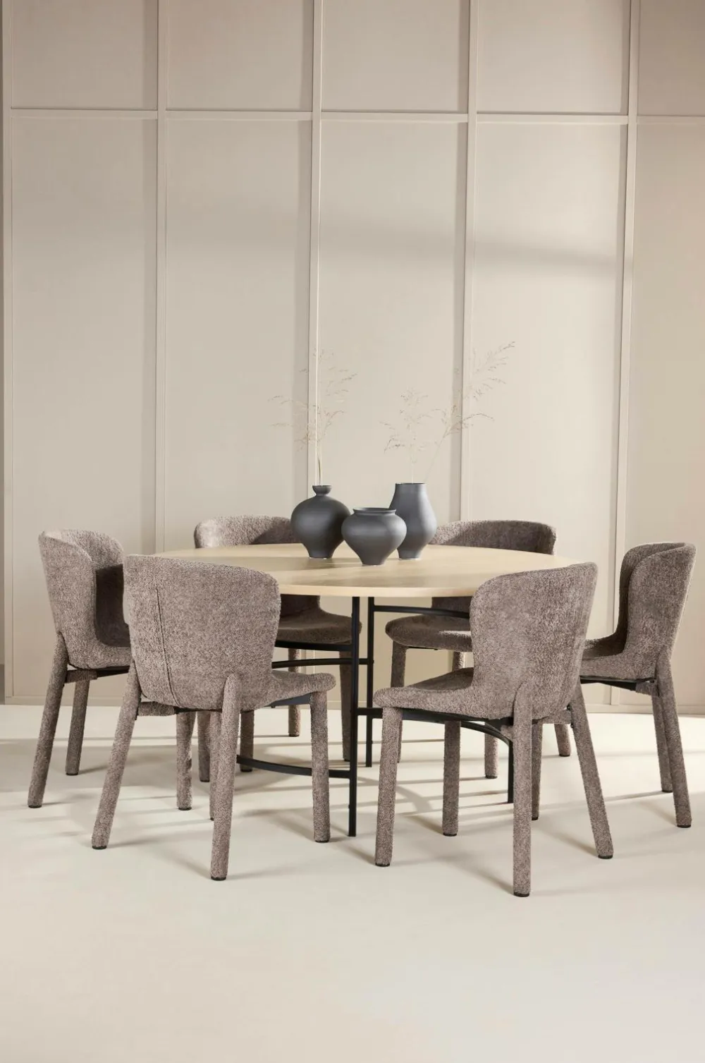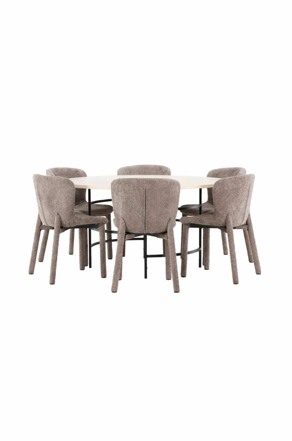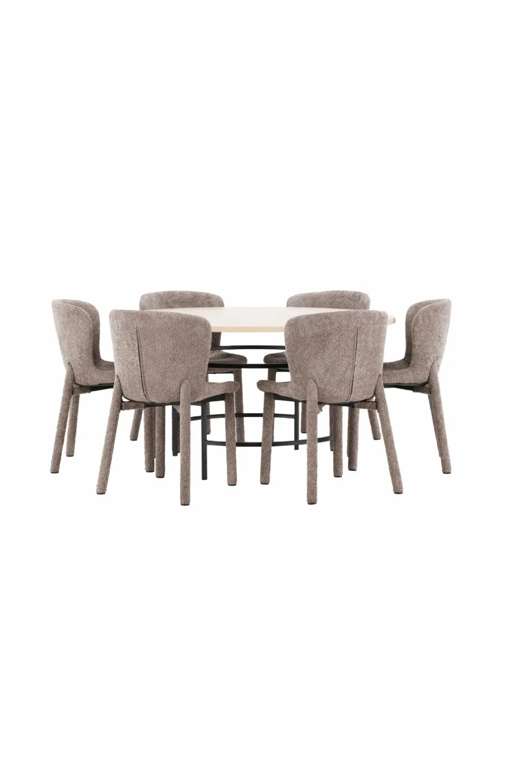 Sammen med bordet står astoria-spisestolene, der er betrukket med stof i høj kvalitet. Den bløde og strukturerede overflade giver stolene et sofistikeret og indbydende udseende, perfekt til at skabe en varm og hyggelig spiseplads. Stolene har et ergonomisk udformet ryglæn og et behageligt sæde, som gør dem ideelle til lange, hyggelige måltider. Stoffets raffinerede tekstur og det alsidige design sikrer, at stolene integreres problemfrit i forskellige indretningsstile.