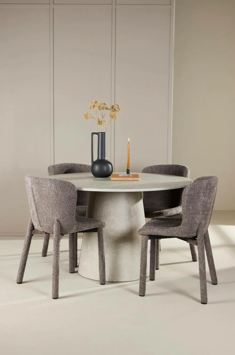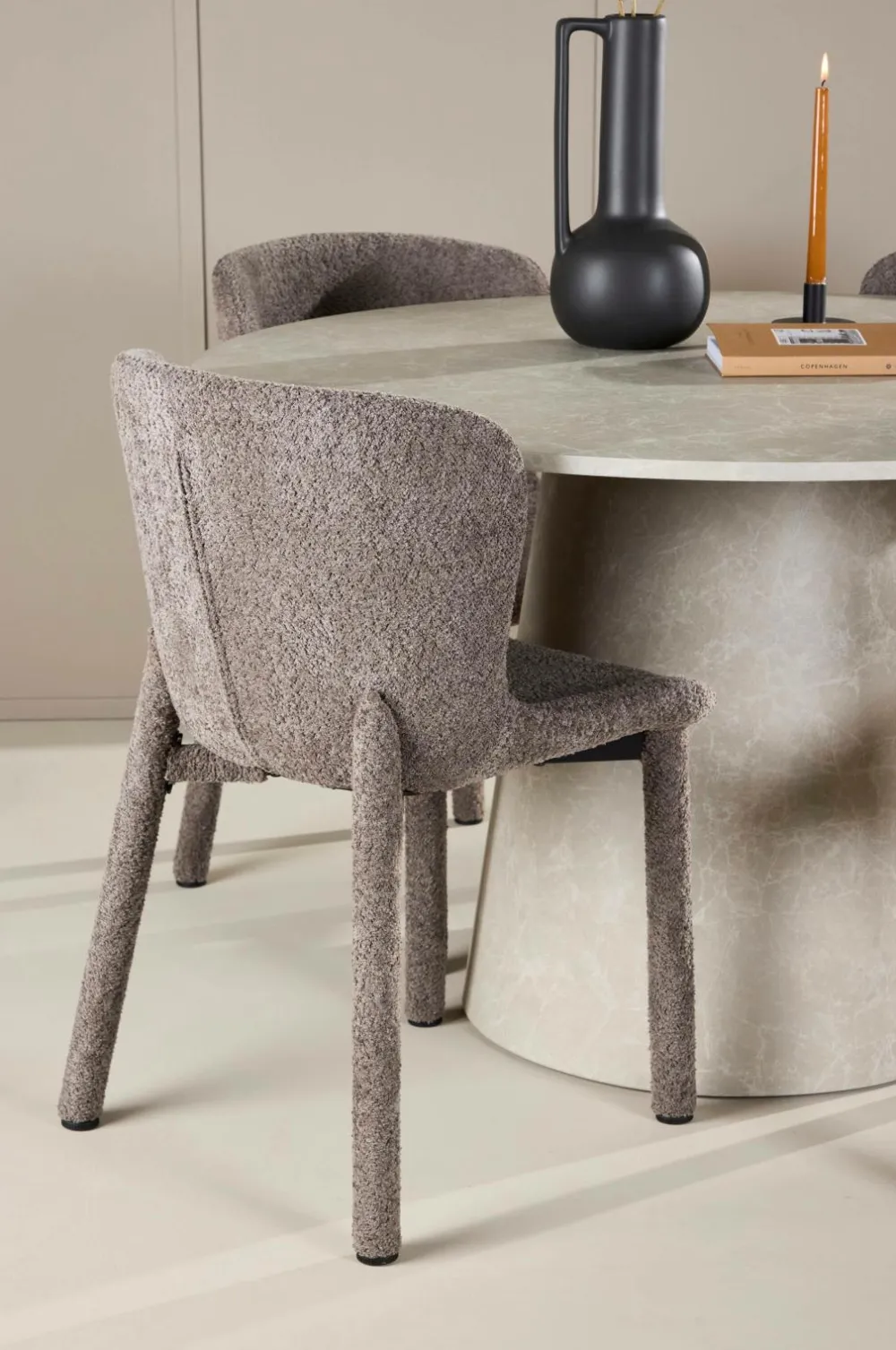 Til bordet hører astoria-spisestolen, som er betrukket med blødt, struktureret stof. Stolen kombinerer en luksuriøs og indbydende fornemmelse med ergonomisk komfort. Det raffinerede stof giver astoria en eksklusiv og tidløs karakter, mens det alsidige design gør, at den ubesværet kan blandes med forskellige indretningsstile. Stolen er designet med et ergonomisk ryglæn og et generøst polstret sæde og giver en afslappende og støttende siddeoplevelse, der er ideel til lange middage og sociale stunder.