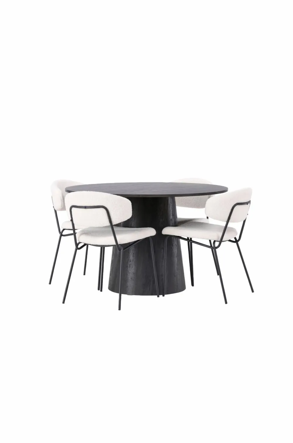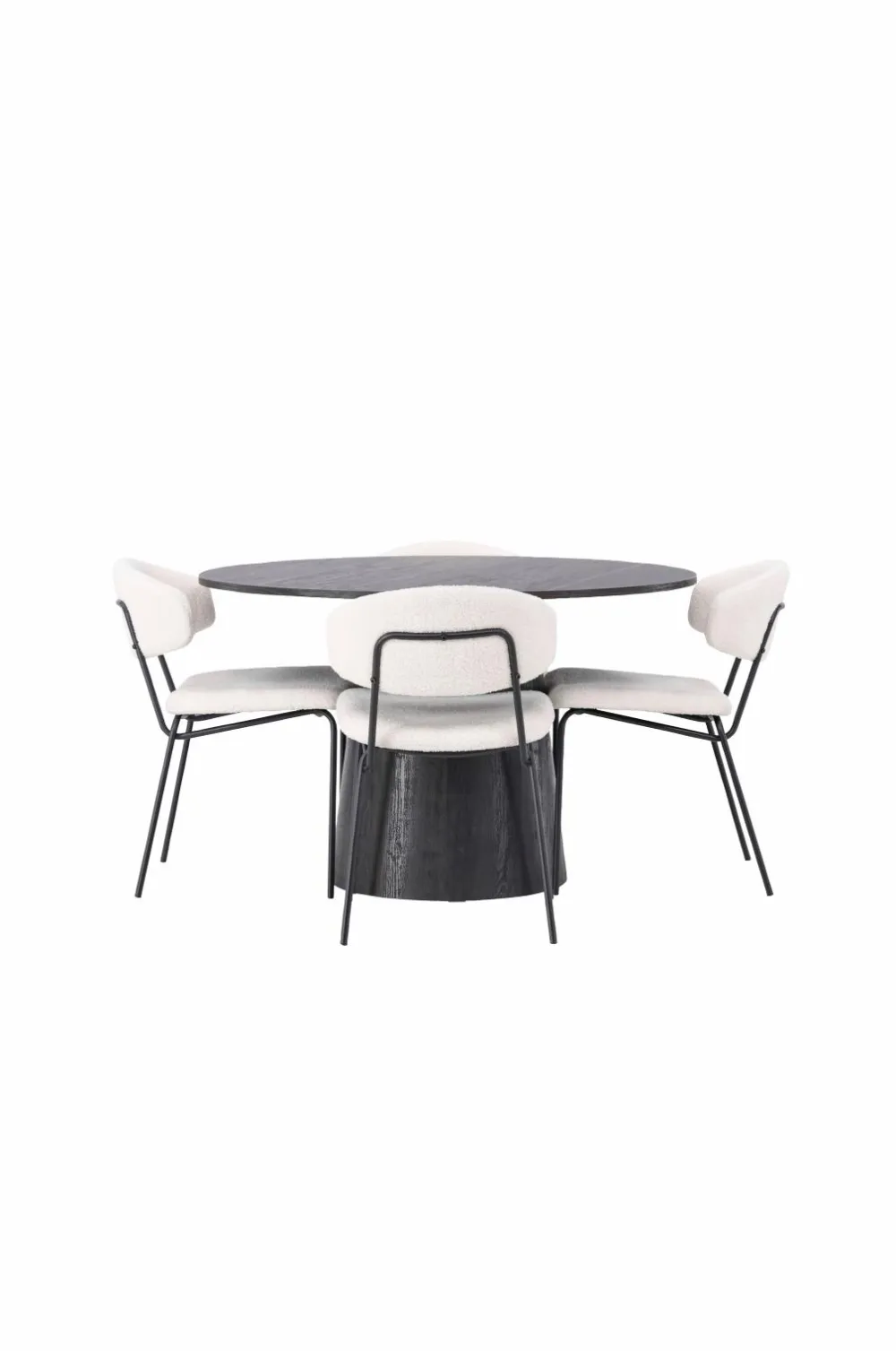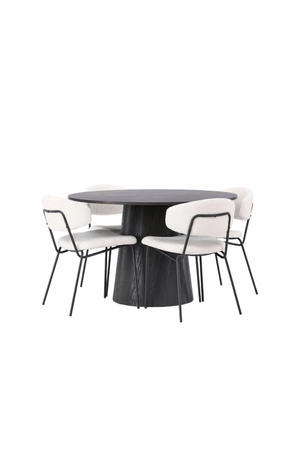 Indret dit hjem hyggeligt og indbydende! Venture Designs vidunderlige, runde spisebord Lanzo har et gennemgående helhedsdesign i MDF med en tynd bordplade og et snoet cylinderformet stel, der er centreret under midten af bordet. Her i flot kombination med Venture Designs spisebordsstole fra serien Chico. Stolen er i boucléstof med polstret sæde og ryglæn for ekstra komfort. Benene er smalle i stål, hvilket giver stolen en luftig følelse. Inviter til et charmerende midtpunkt!