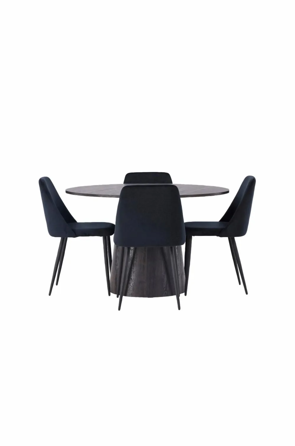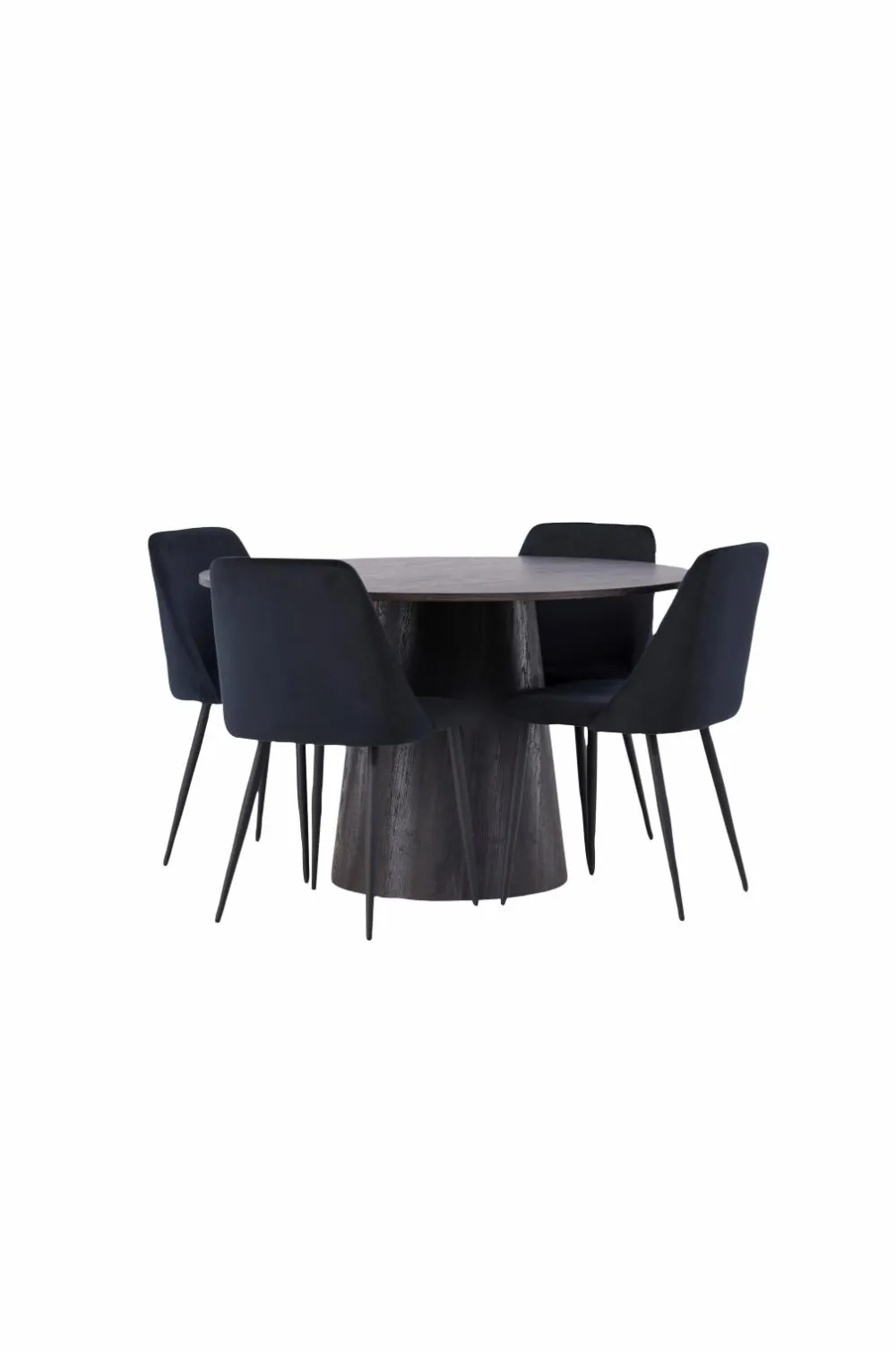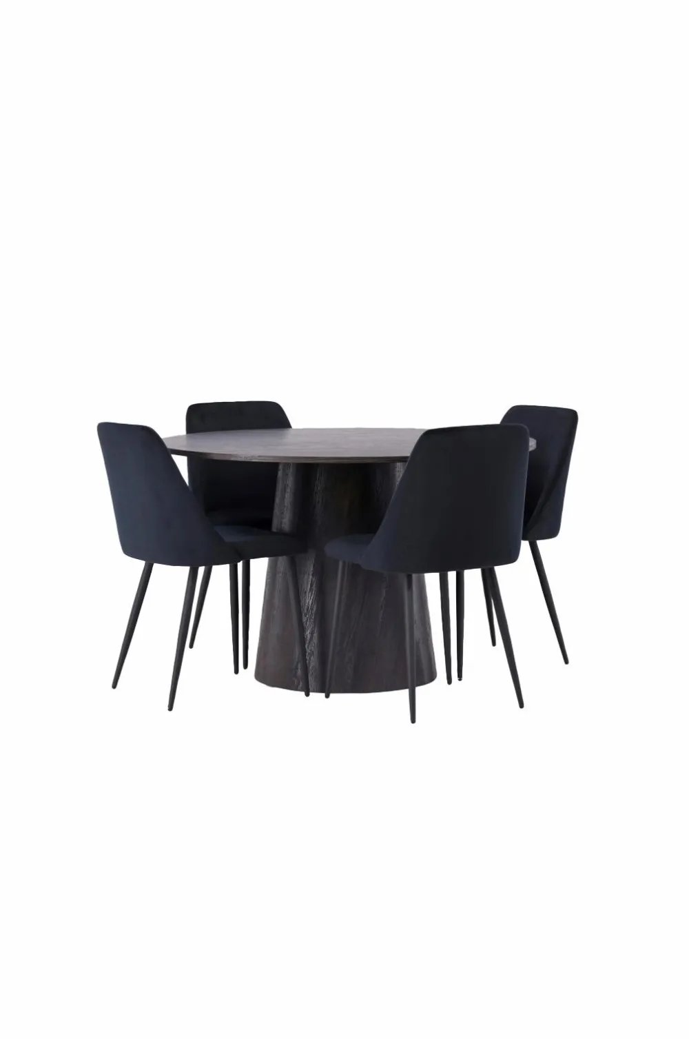 Skab en indbydende atmosfære! Venture Designs vidunderlige, runde spisebord Lanzo har et gennemgående helhedsdesign i MDF med en tynd bordplade og et snoet cylinderformet stel, der er centreret under midten af bordet. Her i perfekt kombination med spisebordsstole fra serien Night. Stolen har fuldpolstret sæde i velourstof og stoleben i matchende farve. Her sidder du både behageligt og moderne!