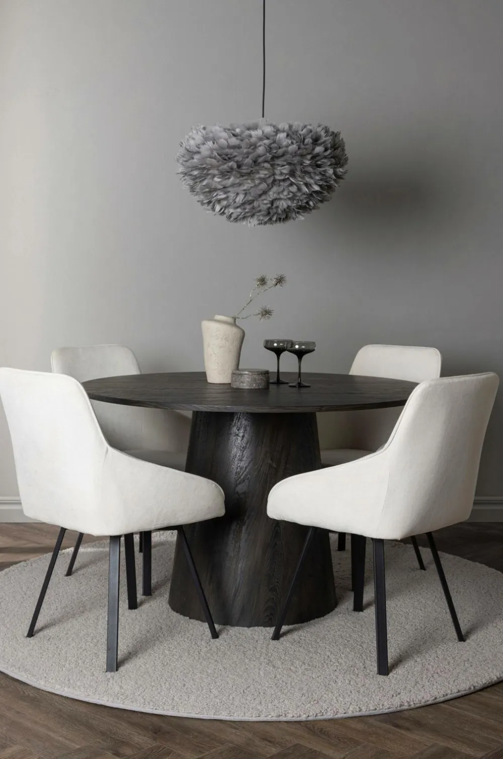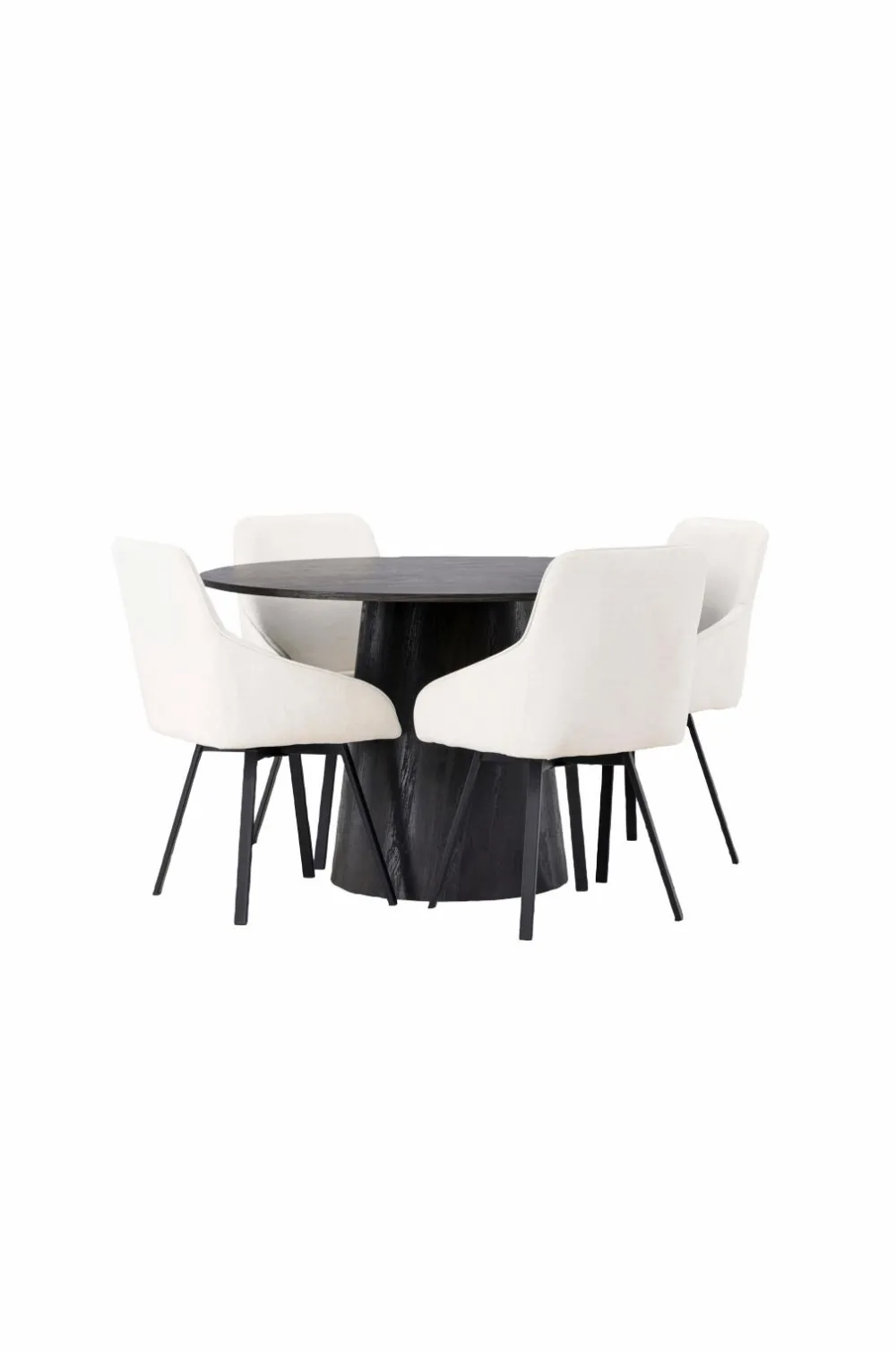 En behagelig spisegruppe i bløde toner! Venture Designs vidunderlige, runde spisebord Lanzo har et gennemgående helhedsdesign i MDF med en tynd bordplade og et snoet cylinderformet stel, der er centreret under midten af bordet. Her i stilren kombination med vores stole fra serien Rosie. Stolen har et fuldt betrukket sæde med integrerede stofarmlæn og let skrå stoleben i metal. Det bløde sæde er polstret for ekstra komfort og inviterer dig til lange behagelige middagsstunder.
