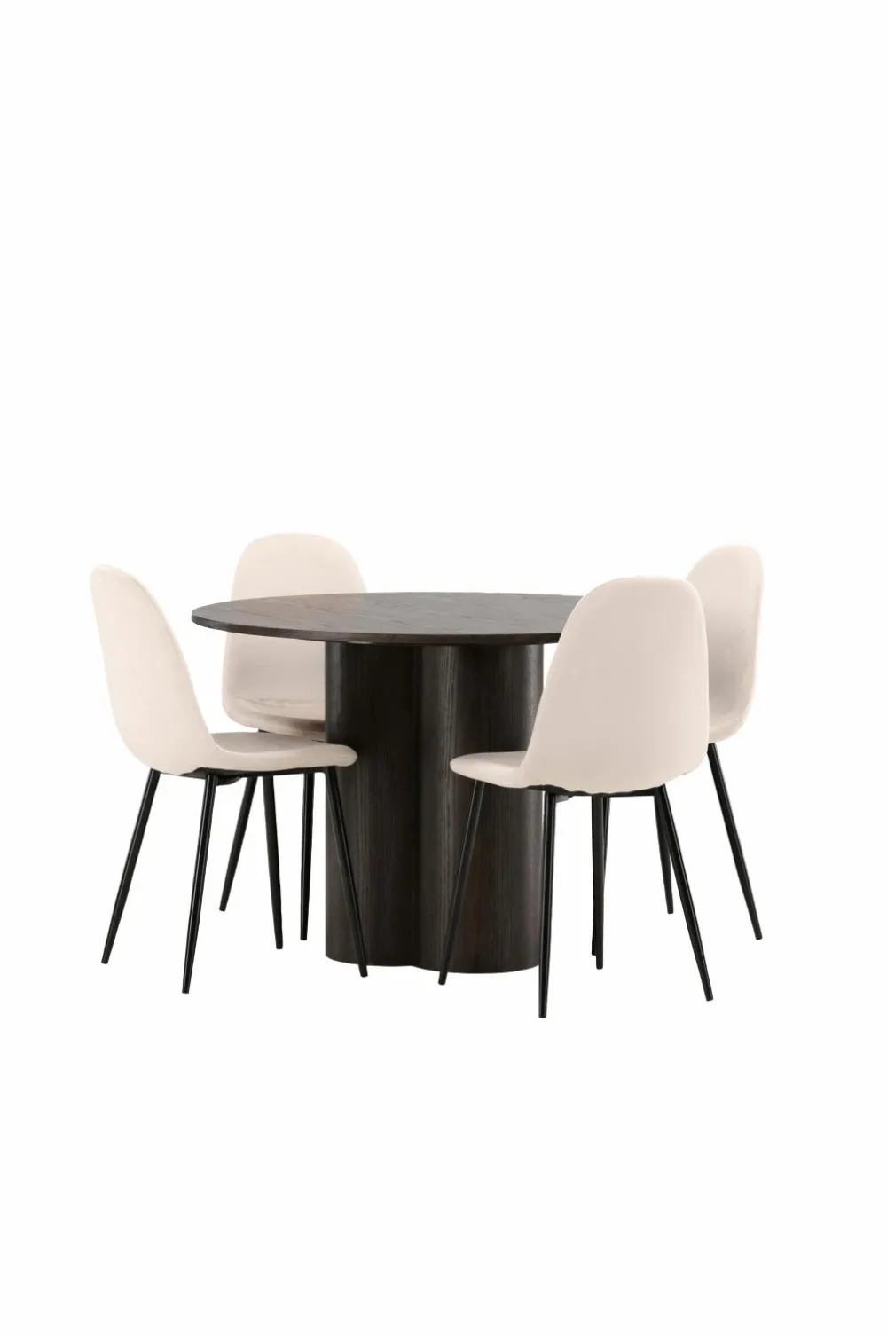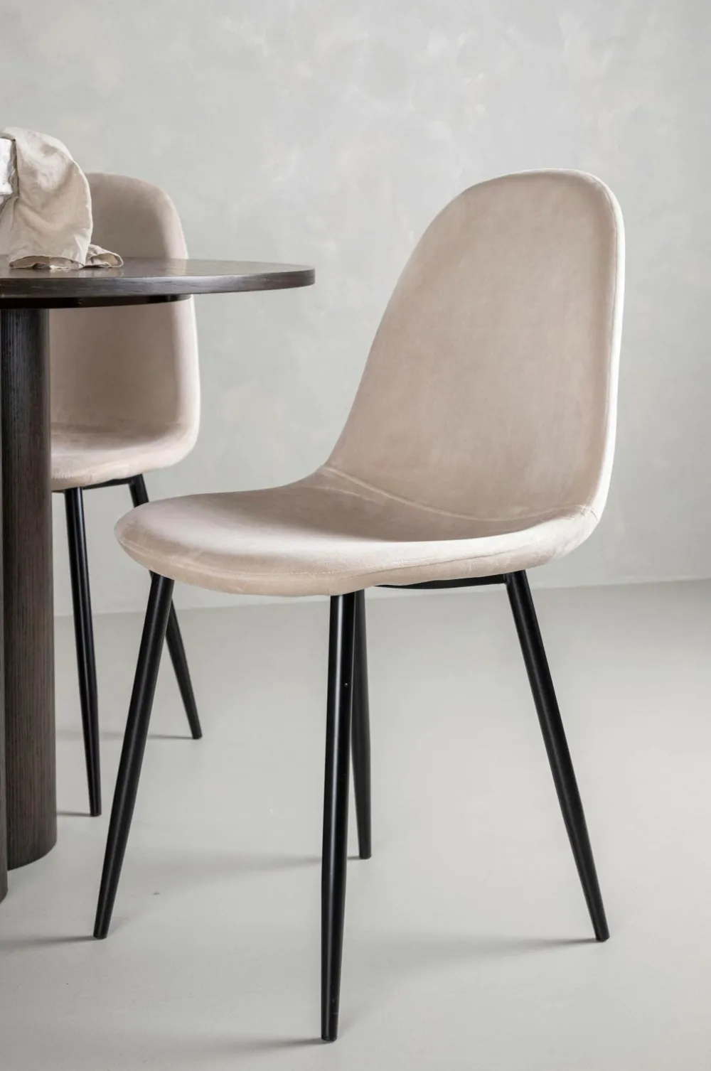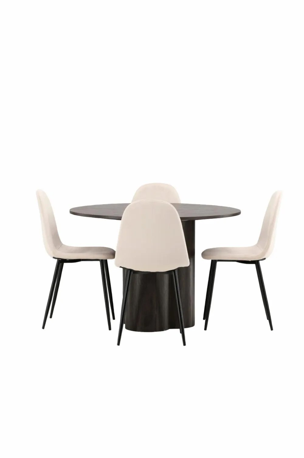 Slip for at vælge mellem stil og komfort! Spisebord Olivia imponerer med sit skandinaviske design og smagfulde udformning. Bordet kommer i en smagfuld farve i MDF med en tynd, rund bordplade og tre cylinderformede ben, der sidder sammen under midten af bordet. Her i perfekt kombination med stole fra serien Polar. Stolen har betræk og et afrundet ryglæn og sæde med velourstof med blød polstring. Ben i sort pulverlakeret metal. Nyd behagelige måltider!