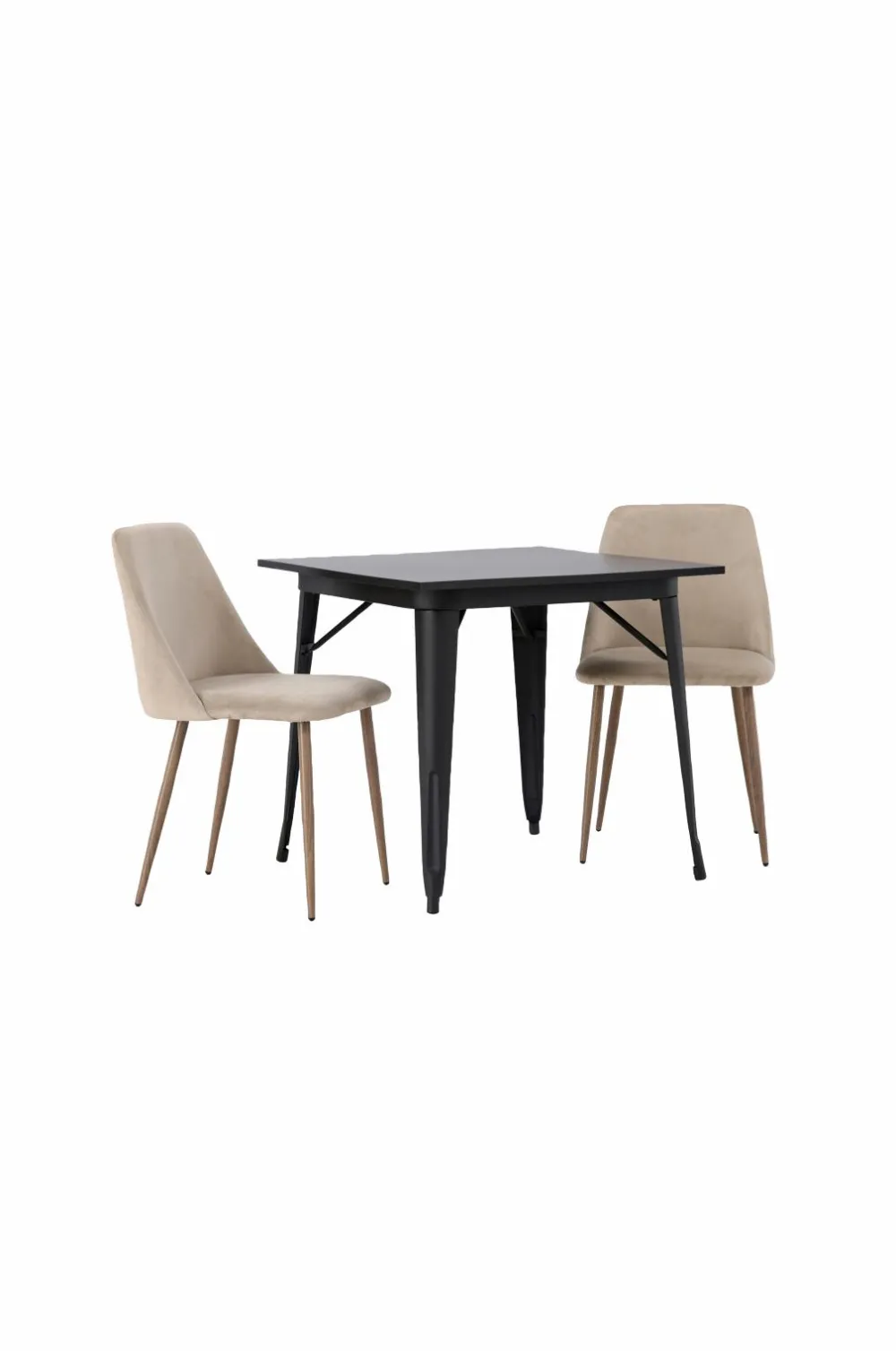 En charmerende spisegruppe for to! Venture designs firkantede spisebord Tempe har en fin størrelse og et trendy, skandinavisk design. Fremstillet med en MDF-bordplade og bordben i metal. Her i flot kombination med spisebordsstole fra serien Night. Stolen har et fuldt polstret sæde i PU-betræk, der føles både luksuriøst og elegant, og benene er i stål. Sædet er også polstret for ekstra komfort. Her får du den perfekte kombination!