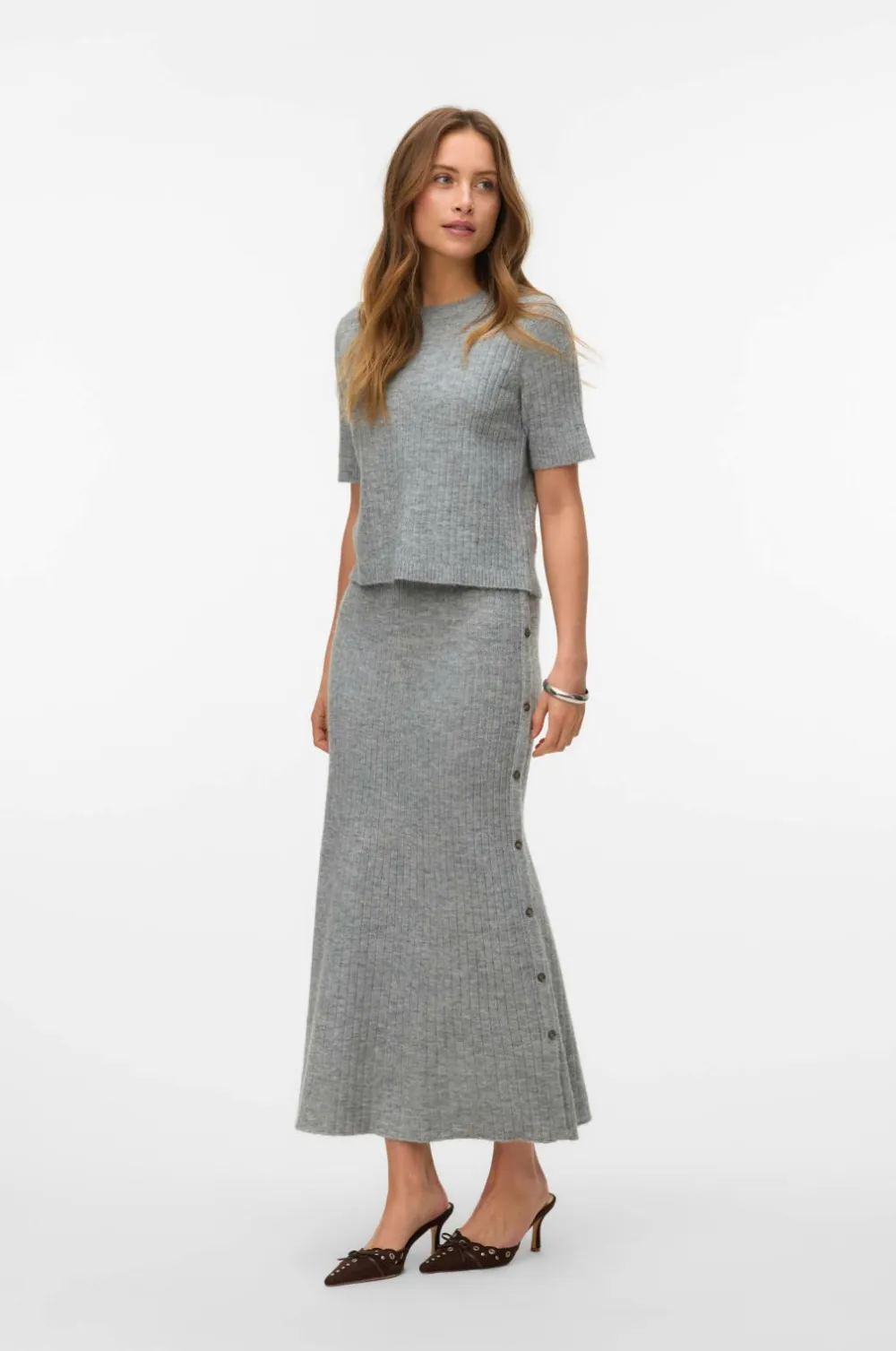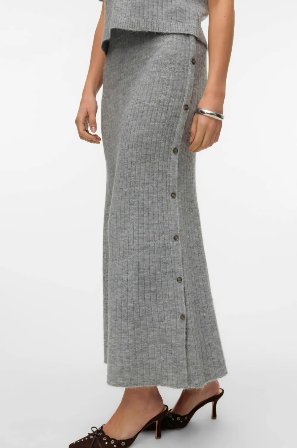• Ribstrikket, ankellang nederdel med dekorative knapper langs den ene side