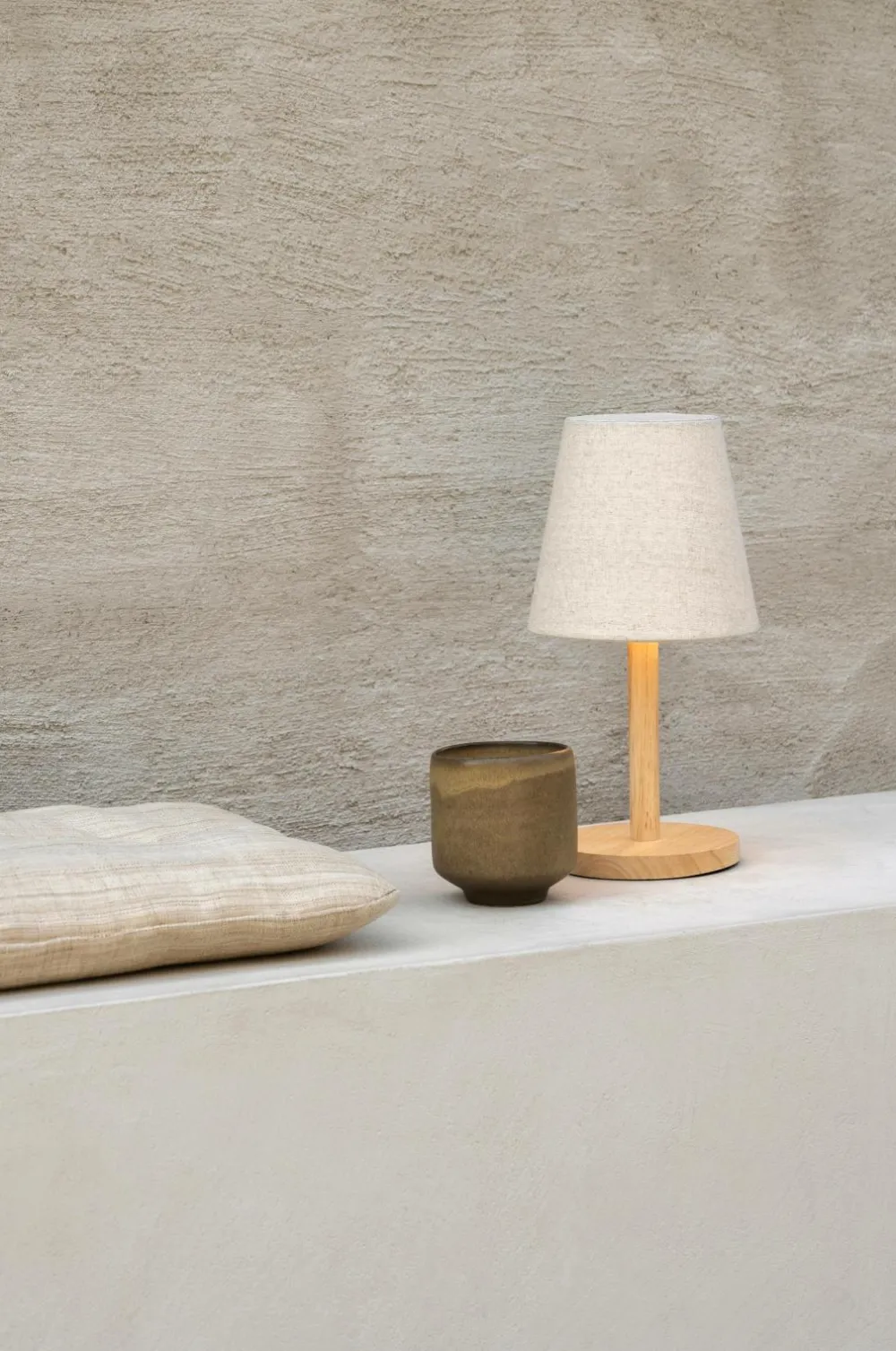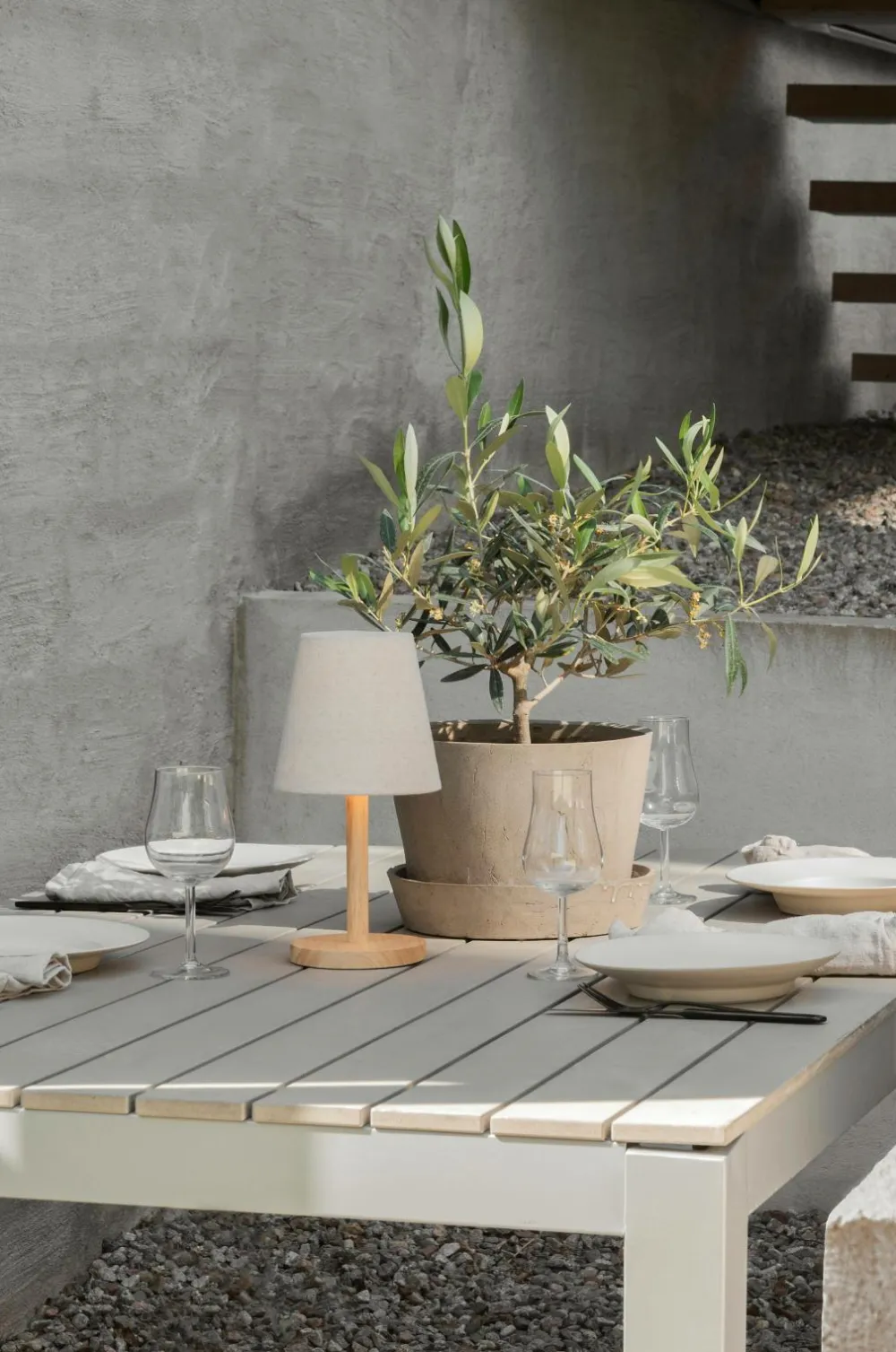 Med en træbase og en tekstilskærm, der er behandlet til at modstå udendørs klimaer, er Tess Table Portable den perfekte lampe til at oplyse både altanen og stuen. Det er en genopladelig lampe med en indbygget LED-lyskilde med varmt hvidt lys og en skjult touch-knap med 3-trins lysdæmper på undersiden af skærmen. Der medfølger en magnetisk opladningsplade til nem opladning. Tess er nem at flytte rundt på og skaber en hyggelig atmosfære, uanset hvor du placerer den.