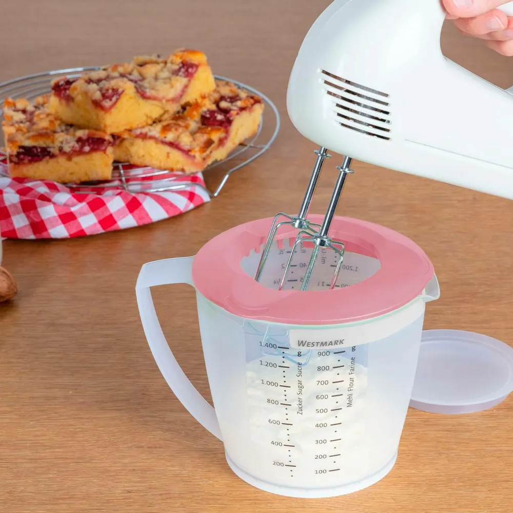 “helena” – den ultimative 1,4-liters blandekande til ethvert køkken, nu i en smuk blå nuance. Designet med et todelt låg, der inkluderer en hældetud med si, perfekt til både servering og opbevaring. Den er udstyret med måleskalaer for de, gb, fr i ml, liter, pints og gram, hvilket gør den ideel til mange forskellige anvendelser. En skridsikker ring i bunden sikrer stabilitet under brug.