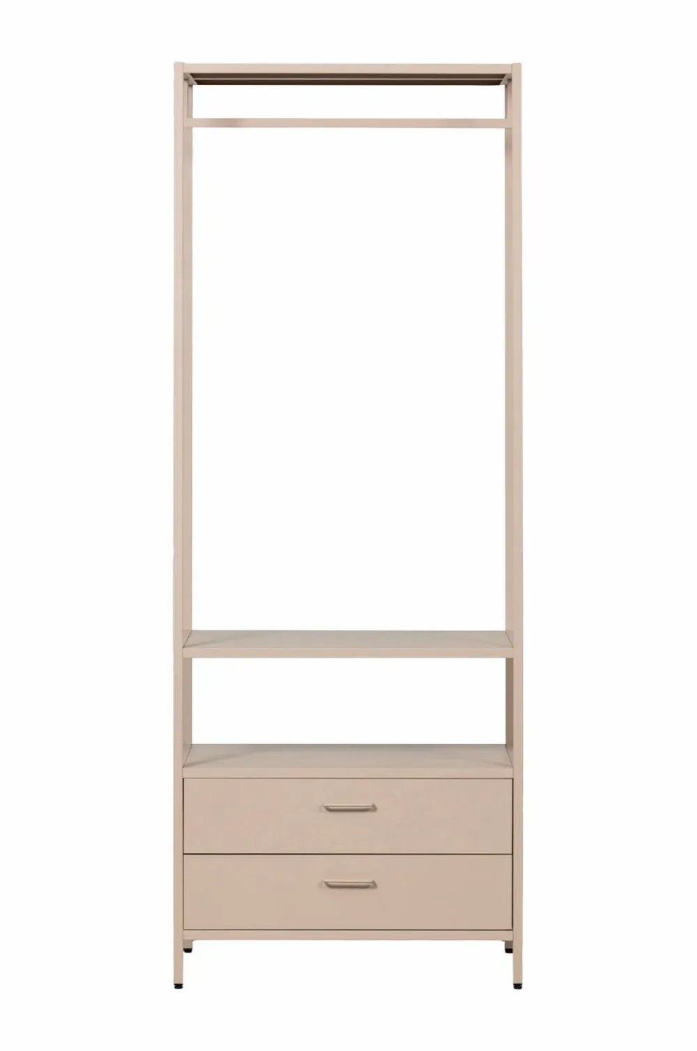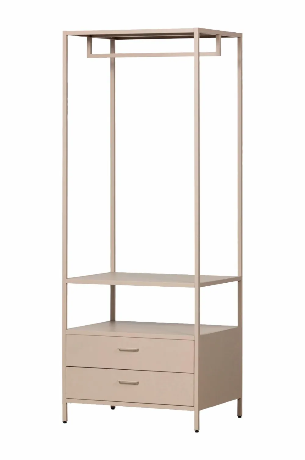 Med Ferris-garderoben behøver du ikke længere lade tøj ligge og flyde. Takket være det åbne tøjstativ har du altid overblik over dine yndlingsoutfits. Garderoben har to rummelige skuffer, der er perfekte til opbevaring af undertøj, tilbehør eller andet tøj. Det stilfulde design passer ind i ethvert soveværelse eller walk-in-closet og tilbyder masser af opbevaringsplads!